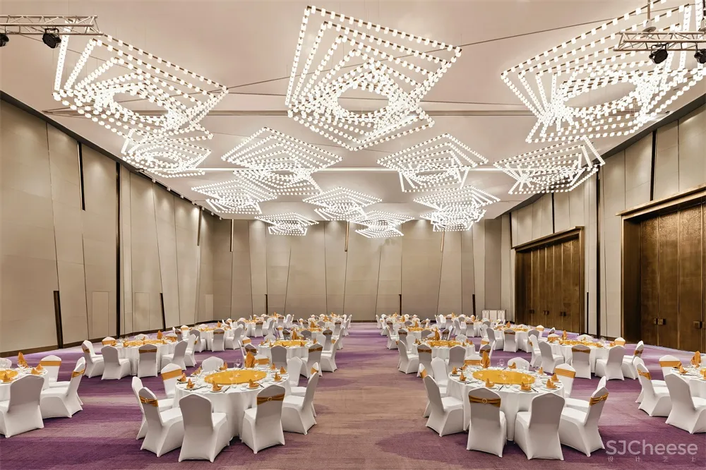 The simplistic design of the column free banquet hall highlights the international style, and reflects the inclusive spirit of the city. The walls and ceilings evolved from the element of dragon scales convey the modern fashion as well as the traditional charms. The dark and mysterious purple smudge of the carpet complements the sharp and straight lines of the space and light tones, corresponding to the sparking lights in the ceiling to create elegant and romantic ambience.