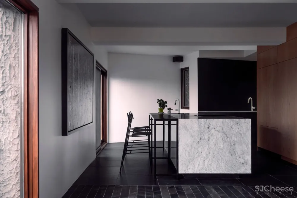 在不同的层面上,住宅的材料与现有建筑融为一体,并回归到已有的各种聚合体中。整个项目强调对细节和饰面的关注,这两者通过微妙的组合达到最终实现。房间如同一片织锦,肌理由大理石、水磨石、石板、石头等共同组成。与这些矿物元素相比,柚木家具和黄铜灯具为空间赋予了温暖色彩。木材的加入产生微妙的回音,平衡了新旧元素之间的关系。