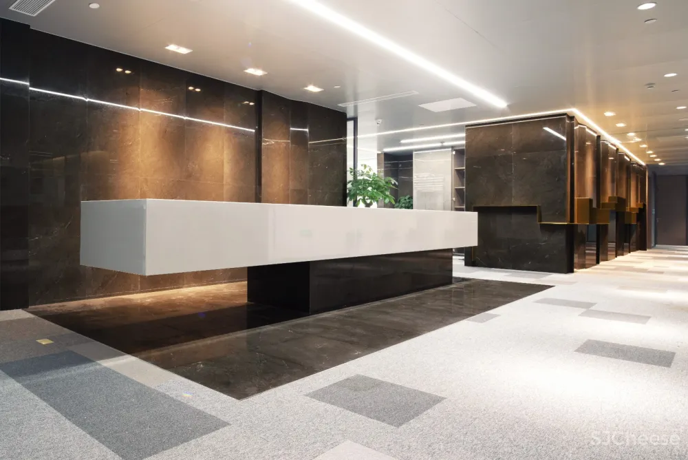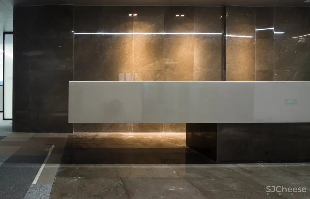 前台通过石材的体积组合与反光形成支撑和悬浮的感觉,悬浮的白色石块像塔式起重机一样矗立在门厅区域。