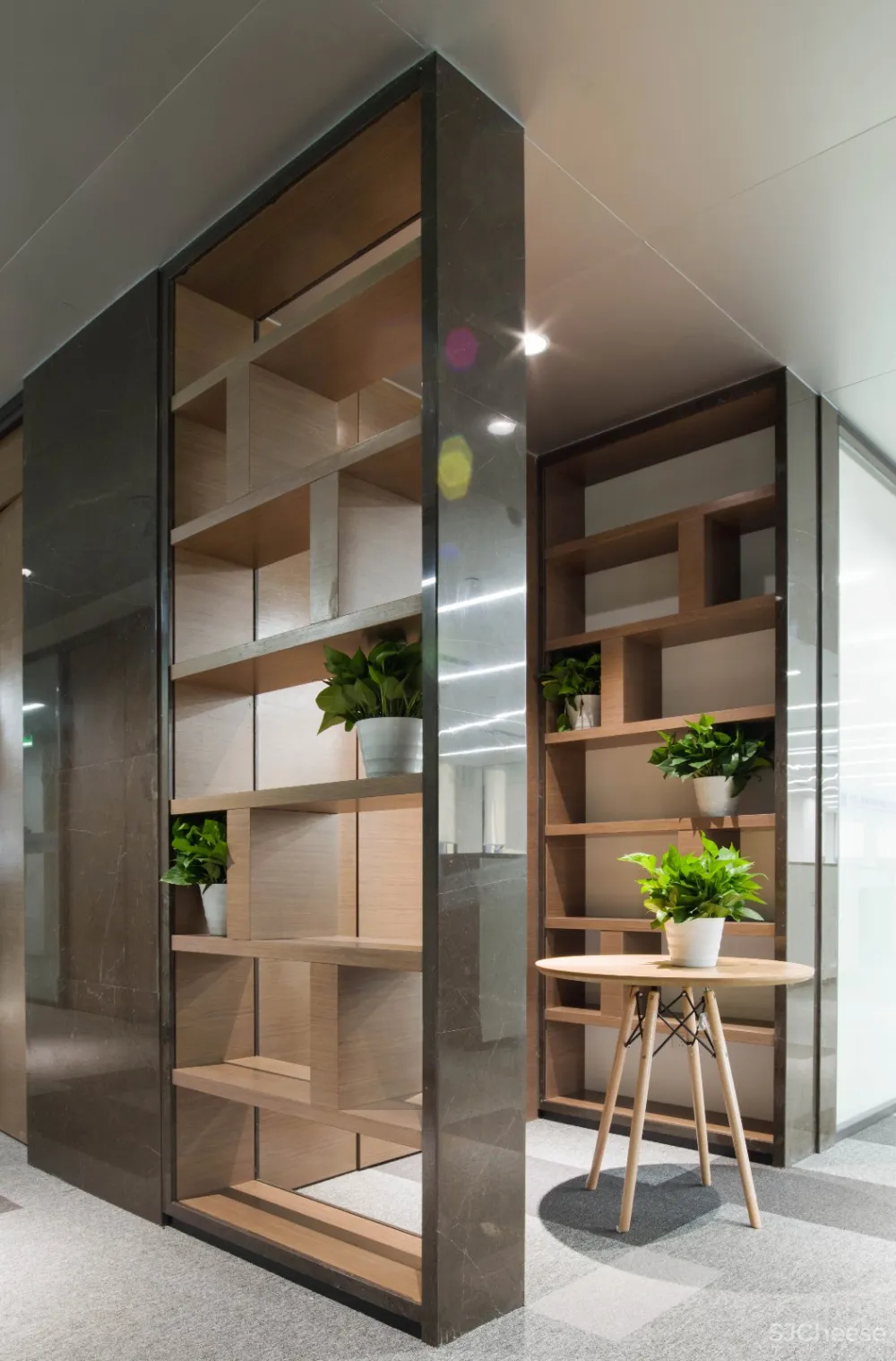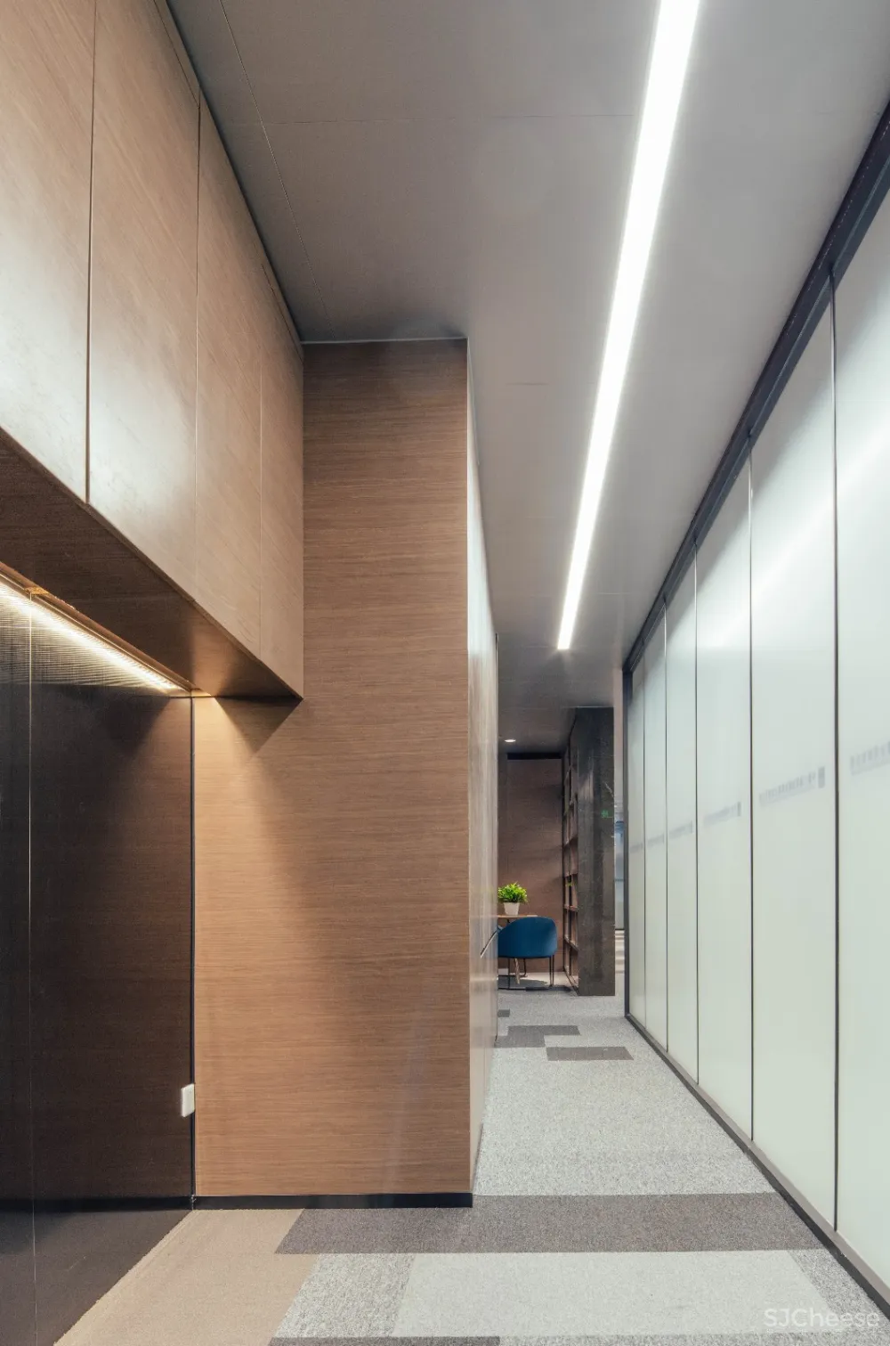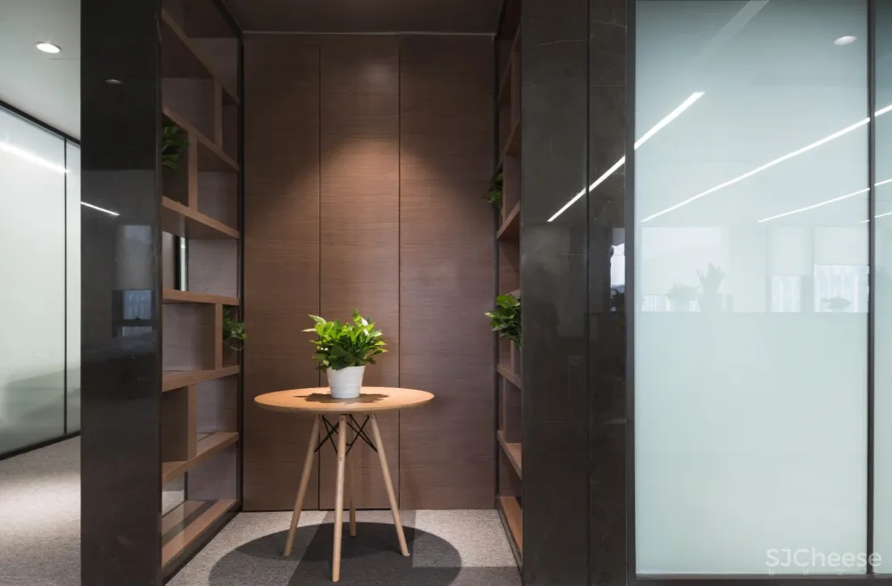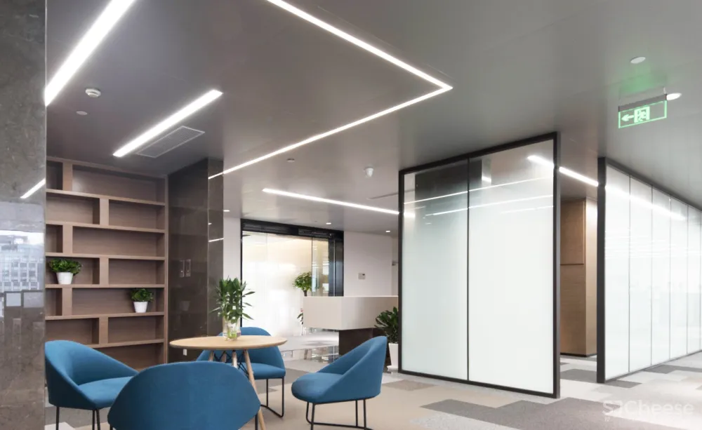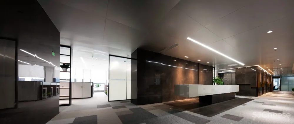 整体天花分为两种材质,复合阳极氧化铝板与多孔平贴矿棉板,软硬结合的质感,反光与吸音相结合的特性。效果上虚实有序,刚柔并济。功能上,多孔平贴矿棉板能控制整个办公空间的噪音及会议空间的混响,保持安静的环境。
