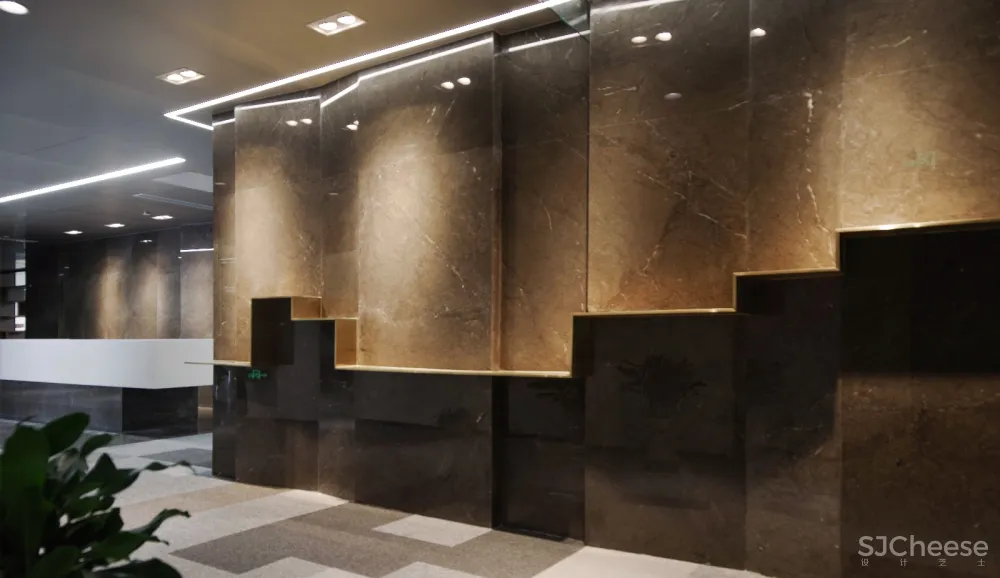 荣誉展示区域用代表城市天际线的起伏金色不锈钢板打造,进一步展示作为建筑公司为城市建设带来的荣誉。