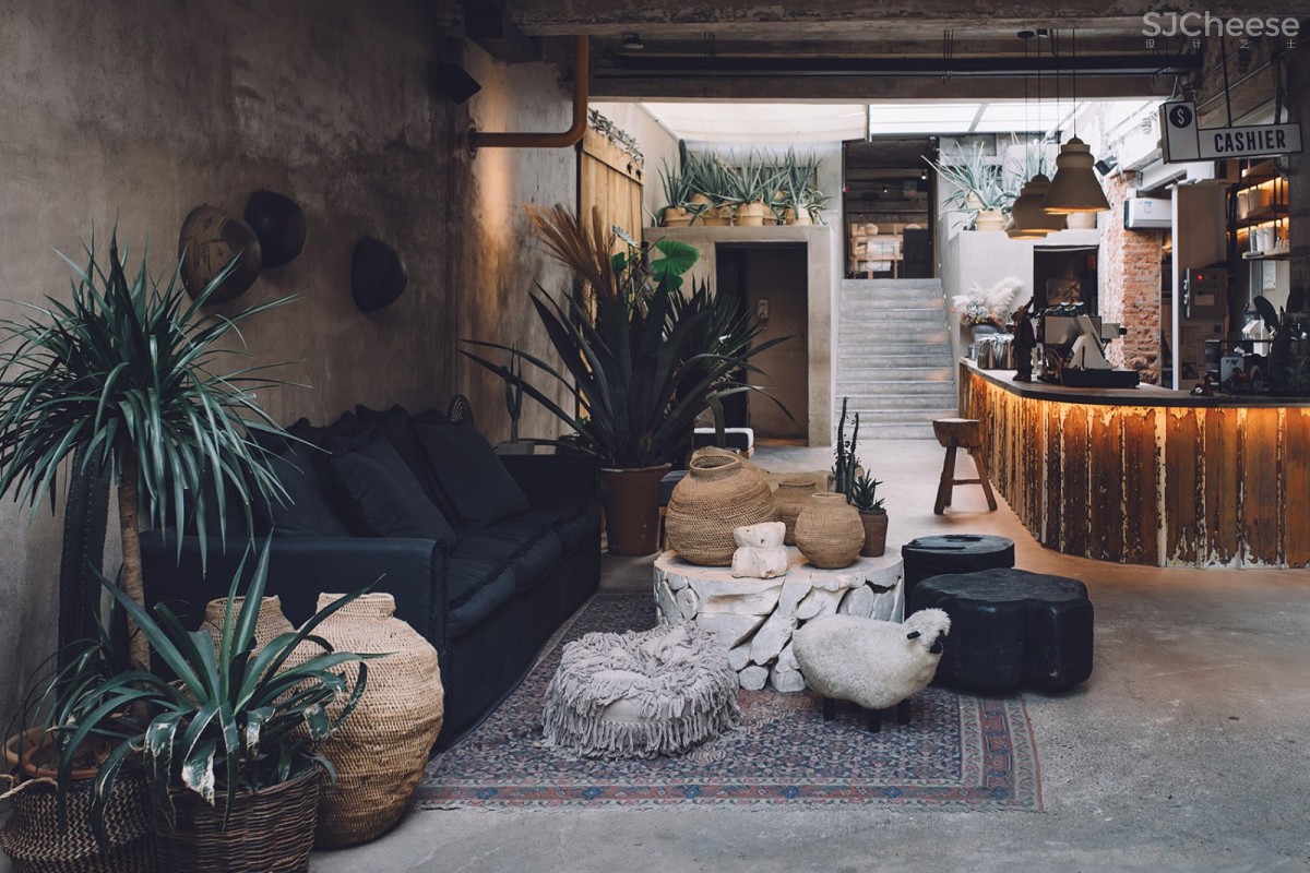 The triangular beam in the Chinese character “人” shape is arranged in a sequence, showing the tall and open pattern of the architectural space. Open the skylight and do not make any modifications to the exposed concrete wall section, so that this style collides and contrasts with the natural texture of the original wooden table and chair. When the warm sunshine comes in, suddenly the tropical scenery of Malaysia comes into view. The space is interspersed with large broadleaf vegetation, holiday mode and dinner party scene is about to start.