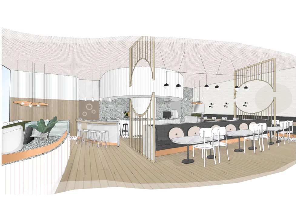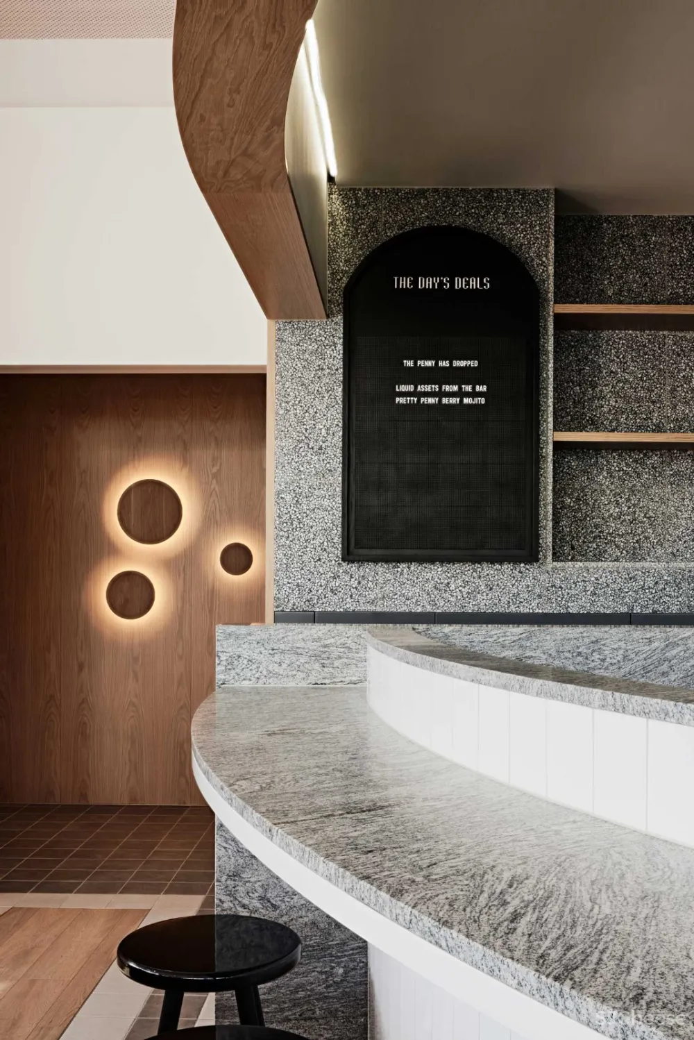 “空间规划是对硬币掉落概念的直接回应,”Dorotic解释道。“酒吧弯曲的形状和周围的座位布局呼应了‘涟漪效应’——业主希望这枚硬币能对Box Hill及其居民产生同样的效果。”