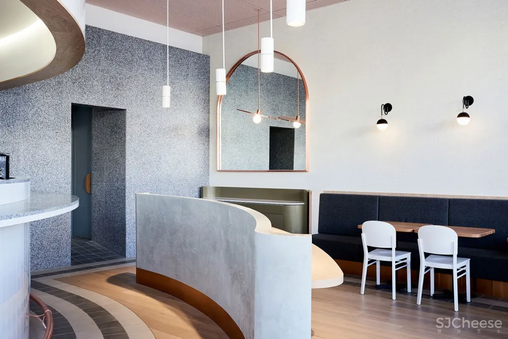 与墨尔本平面设计工作室Pop & Pac合作设计,室内直接响应品牌身份。Dorotic说:“该品牌巧妙地融入了平面图、细木工、纹理和定制配件,比如铜盘吊坠,故意倾斜,就像在运动中暂停一样。”