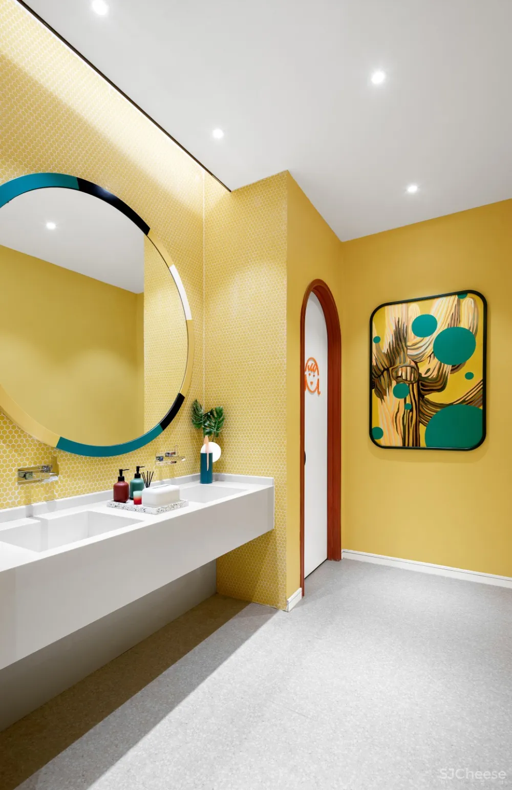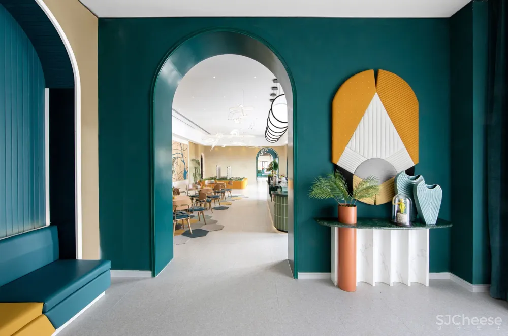 空间最大的亮点在于墙面色彩的运用,亮丽明朗的黄调在灯光的映衬下,酒红、碧绿与墨蓝色调的点染,加深了空间气质对比的浓烈程度,营造出一个艺术表现力弥漫的场域。