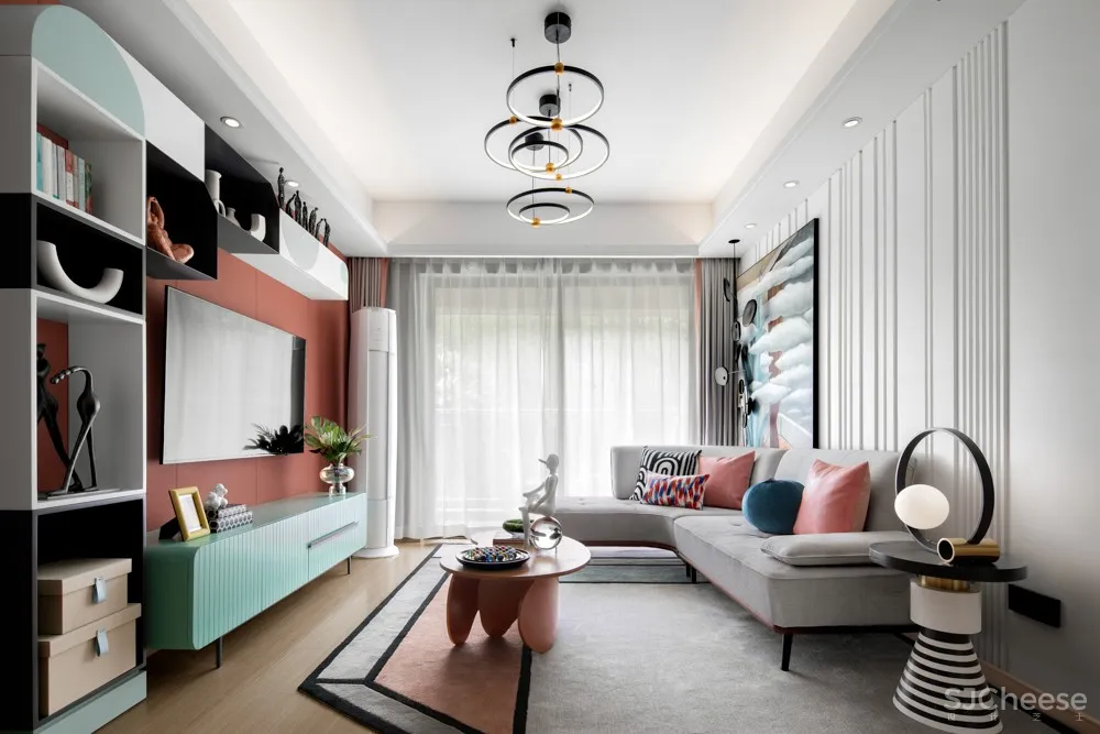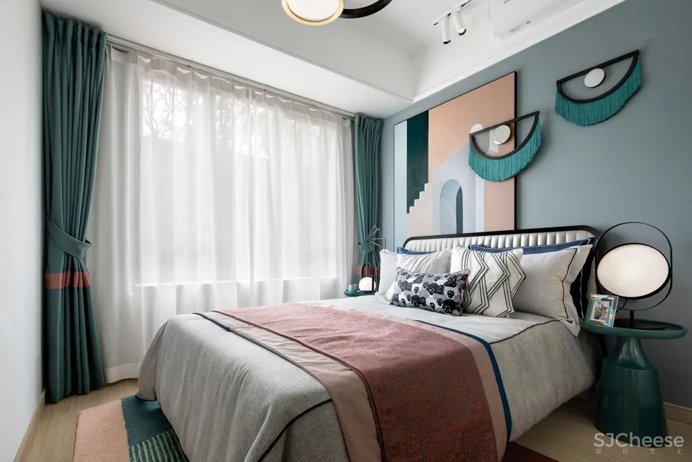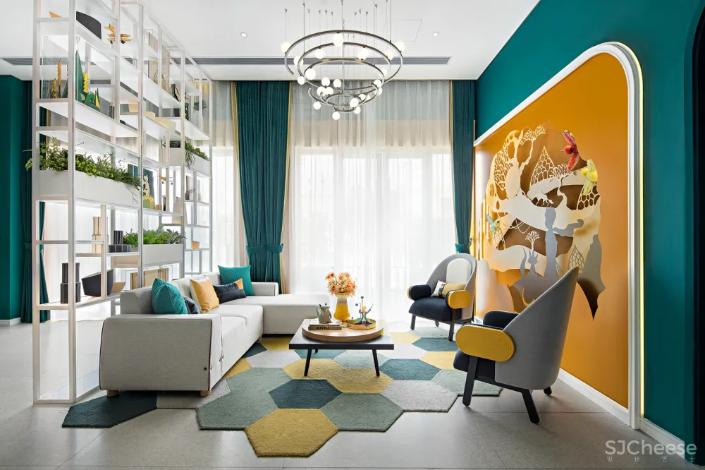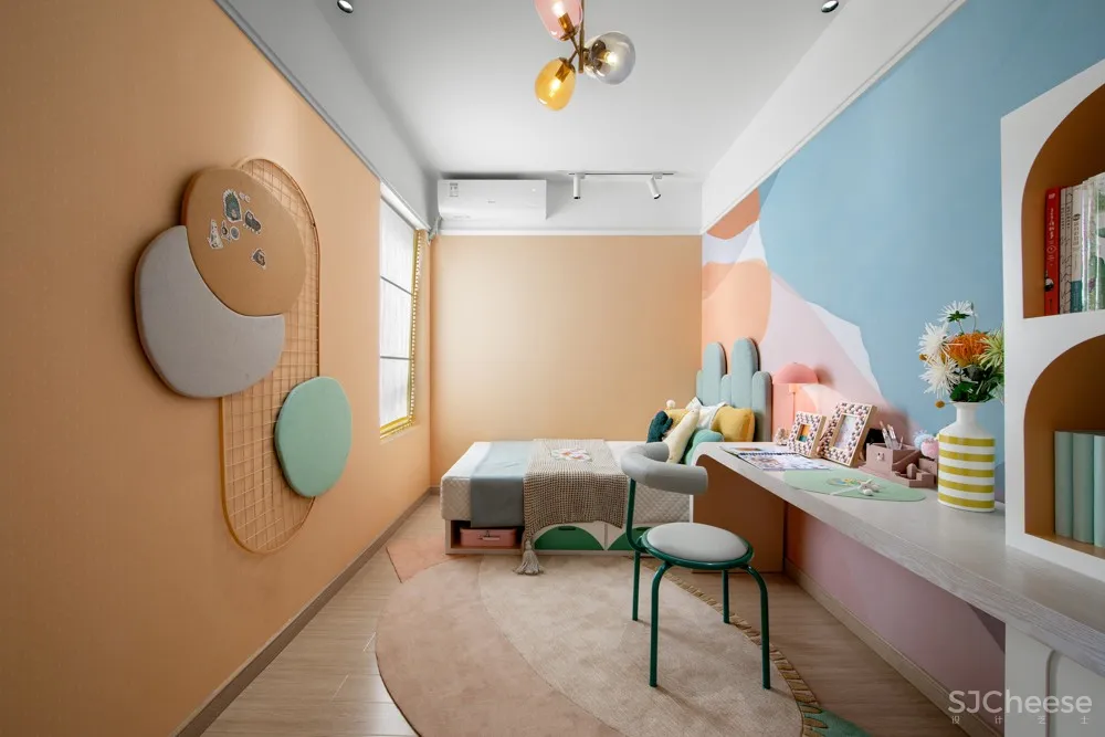几何拼接的格调,色块组合的纹路肌理,营造出极具童年意趣的生活氛围指南,孩童与大人均被空间的唯美格调温暖、治愈,抵达美好生活的深度乐趣。