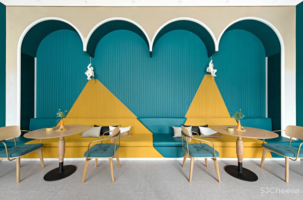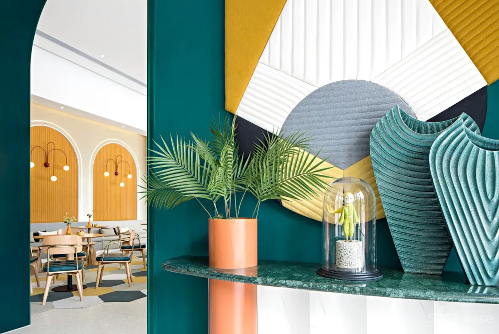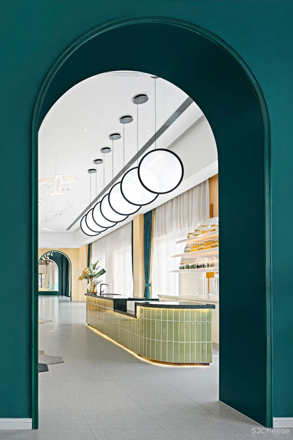 水吧以薄荷浅绿色调为美学基底表达氛围,设计以绘画的艺术手法展现故事性与画面感,植入情感体验,传达一个艺术表现力丰富的空间视像。几何形制在此间的变形与堆叠,写意人们精神内核里愉悦感与幸福感交织的细节之美。