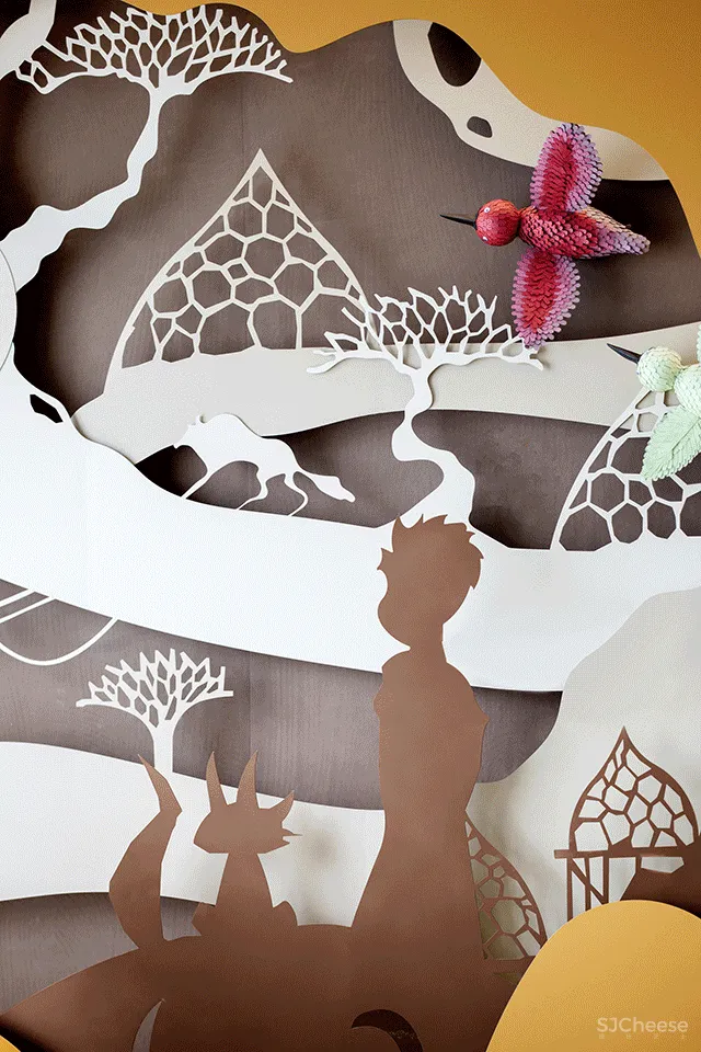 纸雕艺术结合了绘画和雕塑之美,于平面与立体的组合中,将自然森林的意境浓缩进一幅纸雕背景画里,在自然化与感官化的儿童视角下,草木葱郁,飞鸟驻足,生机盎然的丛林里的日出日落,画面纯美而轻松舒适。