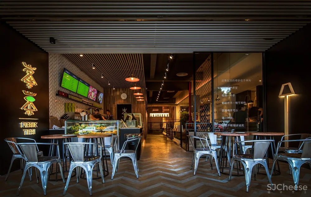 年轻的表现形式多种多样,流行语是其中比较直观的一种。本案在大面积木艺的空间里,引入了一面瓷砖墙,印上了展现年轻人独有个性的流行语,以表达年轻人追求积极向上的生活态度。峯茶最大的自信来源于其茶饮品质,所以在平面布置上,为了使吧台的功能得到更大限度的运用,设计师将吧台前置到入口处,为展示制作工艺全过程提供了一个完全开放的平台,让顾客能亲眼看到茶品的取材制作过程,还能让过往行人也能闻见来自峯茶的茶香、果香。