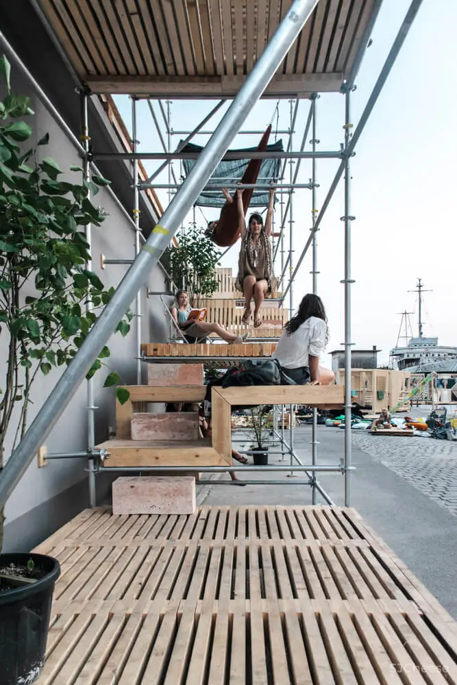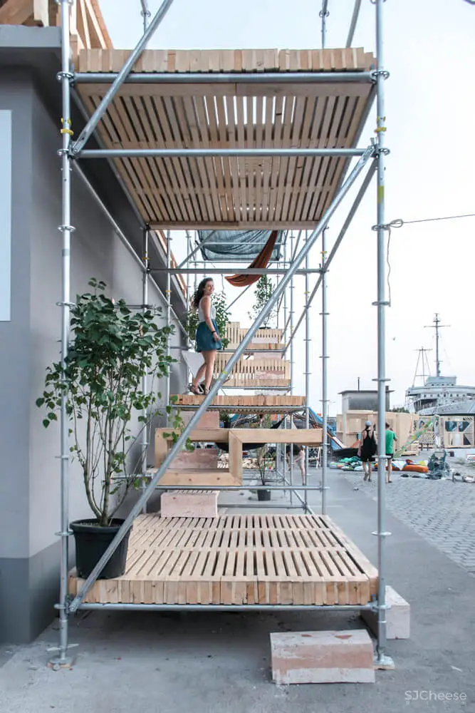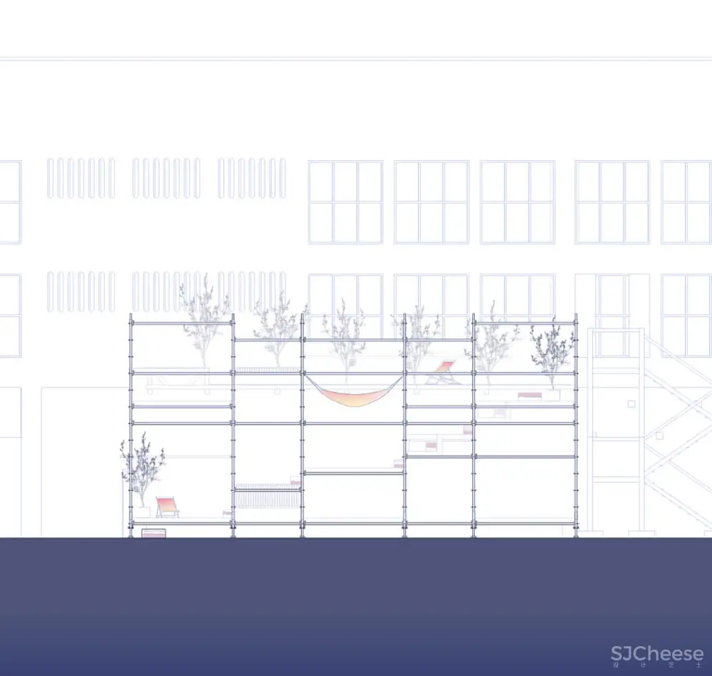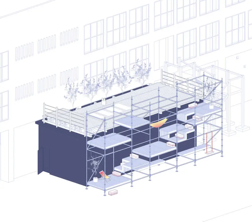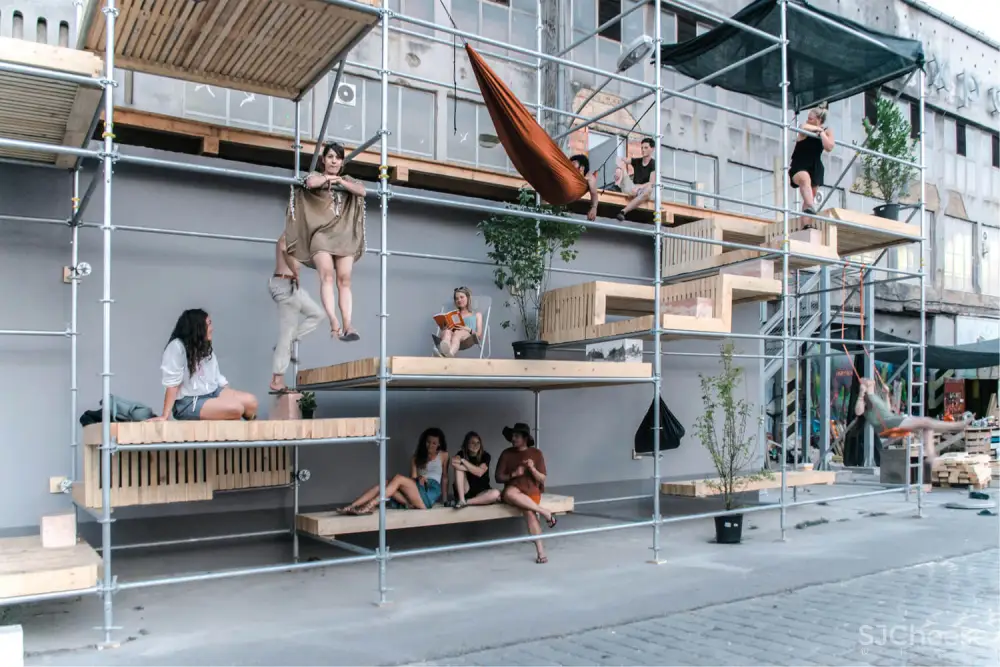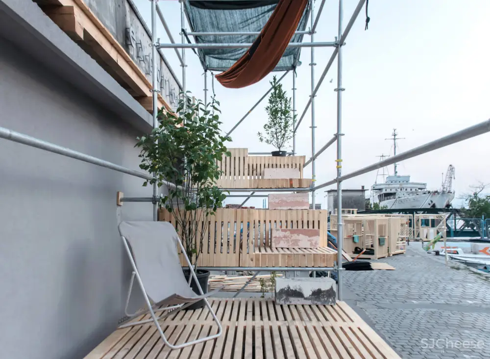 平台以裸露鹰架层层搭建往上延伸,扩展至顶端的聚会平台,建构成保有私密又串连的空间网,并添加环保木栈板、红砖筑为休憩平面,让人们可以自在寒暄休息,充分落实工业美学于公共空间,藉由市民的日常互动,赋予工厂崭新立面,拉近人、建筑、城市三者的距离。