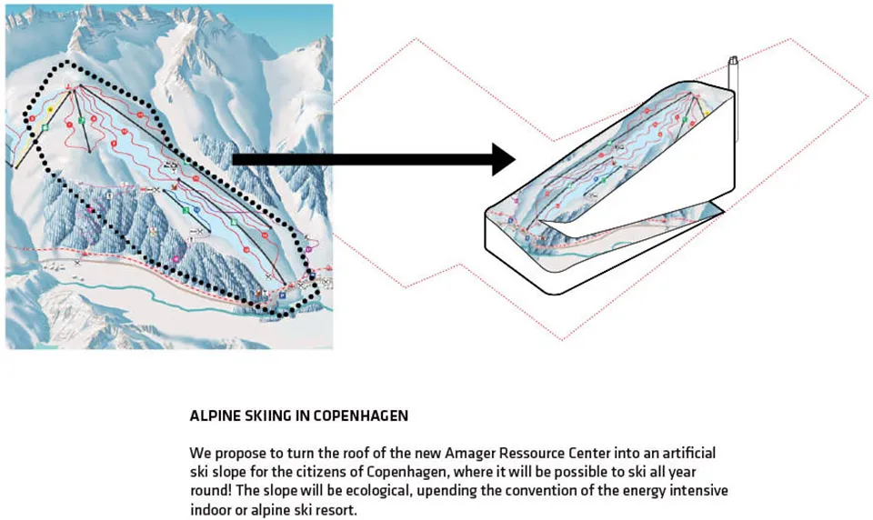 关于CopenHill的设计想法,最早可以追溯到2002年,那个时候Bjarke Ingel的建筑事务所并不叫BIG,而是PLOT。他们所提出的想法是在哥本哈根最密集的地区置入一个都市公共空间,通过将城中最大百货商场的楼顶设计成滑雪坡道般的形态,来应对城中用地紧张的现实挑战。虽然这个设计概念赢得了当时的项目竞赛,但可惜的是其并未兑现,反而是为今天我们所看到的CopenHill项目埋下了一颗种子。大约十年之后,也就是2011年,BIG在与AKT, Topotek 1, Man Made Land, 以及Realities:United的竞争中,最终赢得了哥本哈根新型垃圾焚烧发电厂的国际设计竞赛。