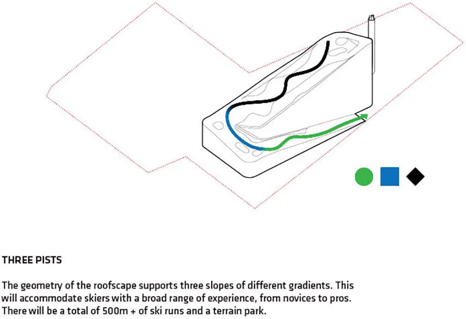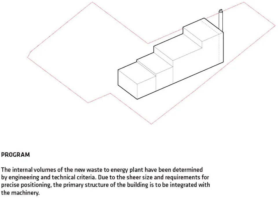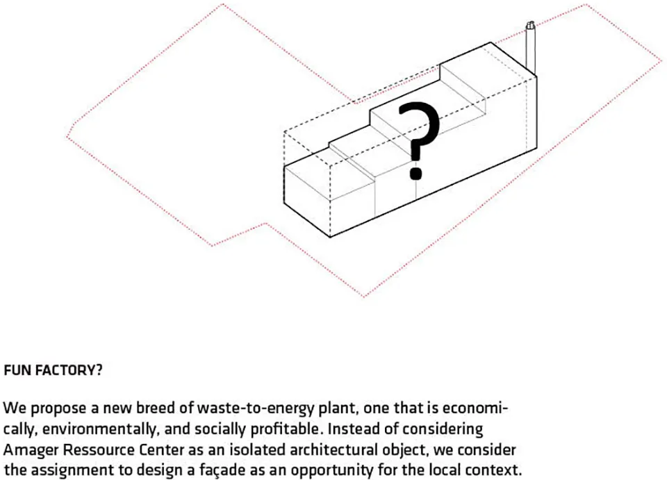 正如BIG在2011年所说的那样:“项目立面所做的设计,其主要目的是改善工厂现有的严重品牌问题。我们希望所设计的立面,不单单只是工厂的一个美丽外表而已。其还应该具备一定的功能性!同时,其所置入的全新功能,还不会与立面的美丽造型产生冲突。在这两者的选择上,我们并不会接受只取其一,我们想要的是二者兼得!”此外,在本次项目中,设计师还提议将工厂的屋顶设计为一个人造滑雪坡,以服务于哥本哈根的市民和就近的其他城市。