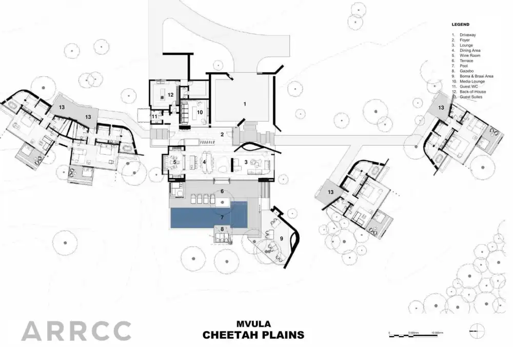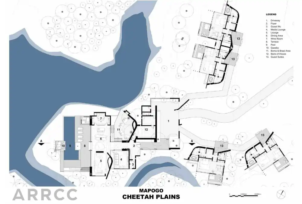 这座猎豹平原的小屋被分为了三个私人的部分,并被称作是平原房屋。这些房屋由独立的建筑群组成,而不是像典型的小屋类型一样,卧室套房包围着一个中央公共空间。