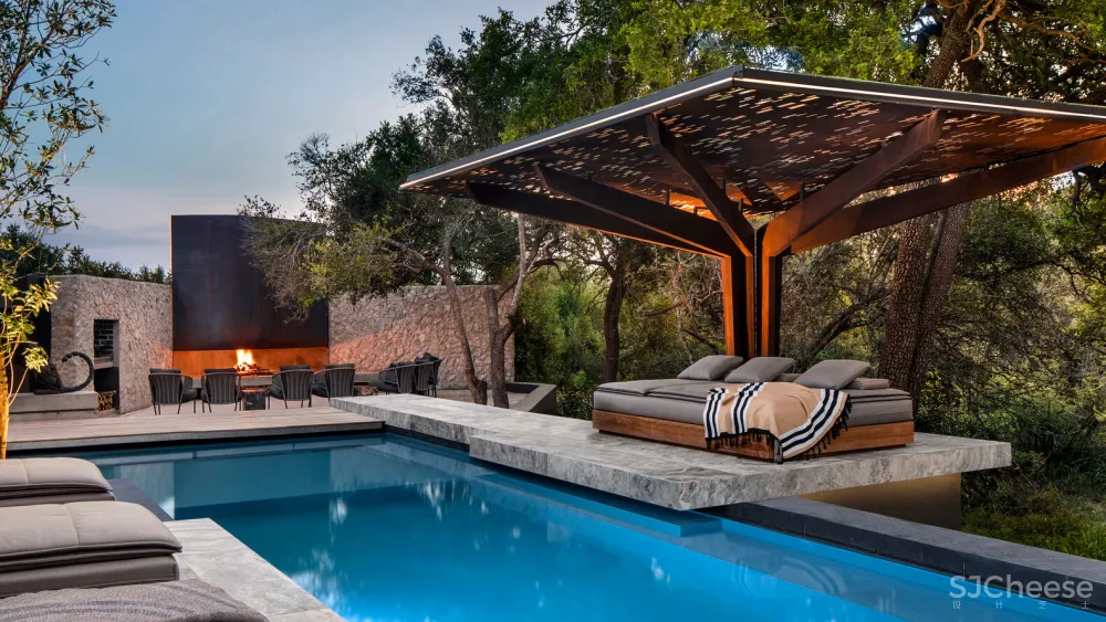 户外空间的特征被编织进了每个平原房屋周围的空间中,包括一个室外烧烤区,一个宽阔的露台和一个加热池。具有雕塑感的生锈钢材质的亭子,是受到了当地坦波提树的树冠的启发,斑驳的光线通过悬挑的树枝被过滤。每一个房屋都有配备了一个厨师专用的商业厨房。互成角度,或是呈分叉状的建筑形式是该小屋设计的核心美学特征,其灵感来自于该区域本地的刺槐。