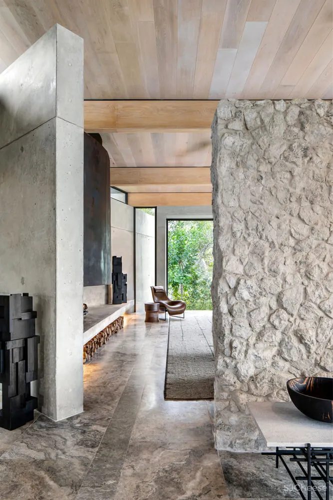 一种独特的关于场所的感觉通过大量使用当地天然的材料和当地工匠手工定制的设计体现出来。有机的自然形式被抽象为室内设计的图案、形式和韵律。例如,壁炉的黑色钢制烟道的曲率,与建筑中的直线形成巧妙的对比。富有肌理的织物,老化的皮革和木纹微妙的抵消了黄金、青铜和黑色的光滑的细节。
