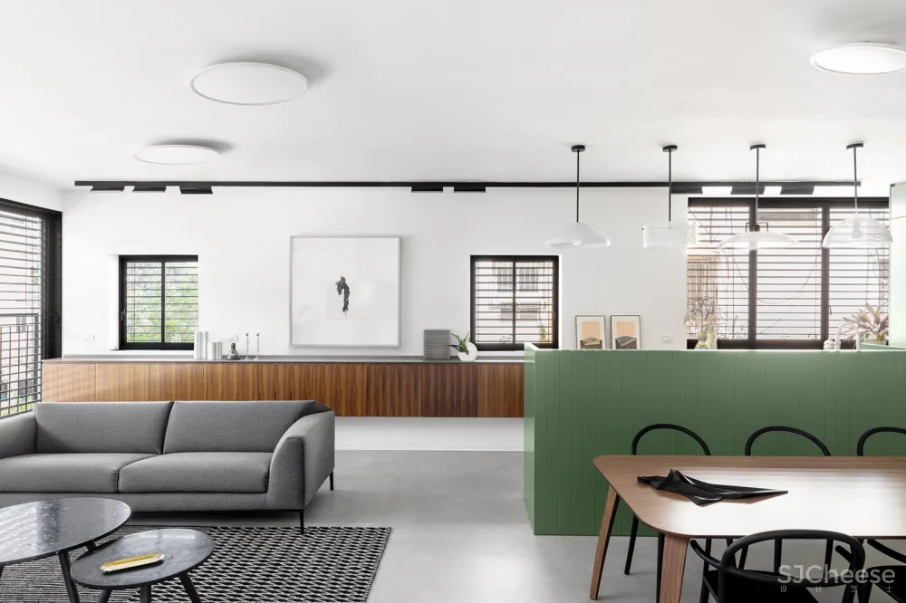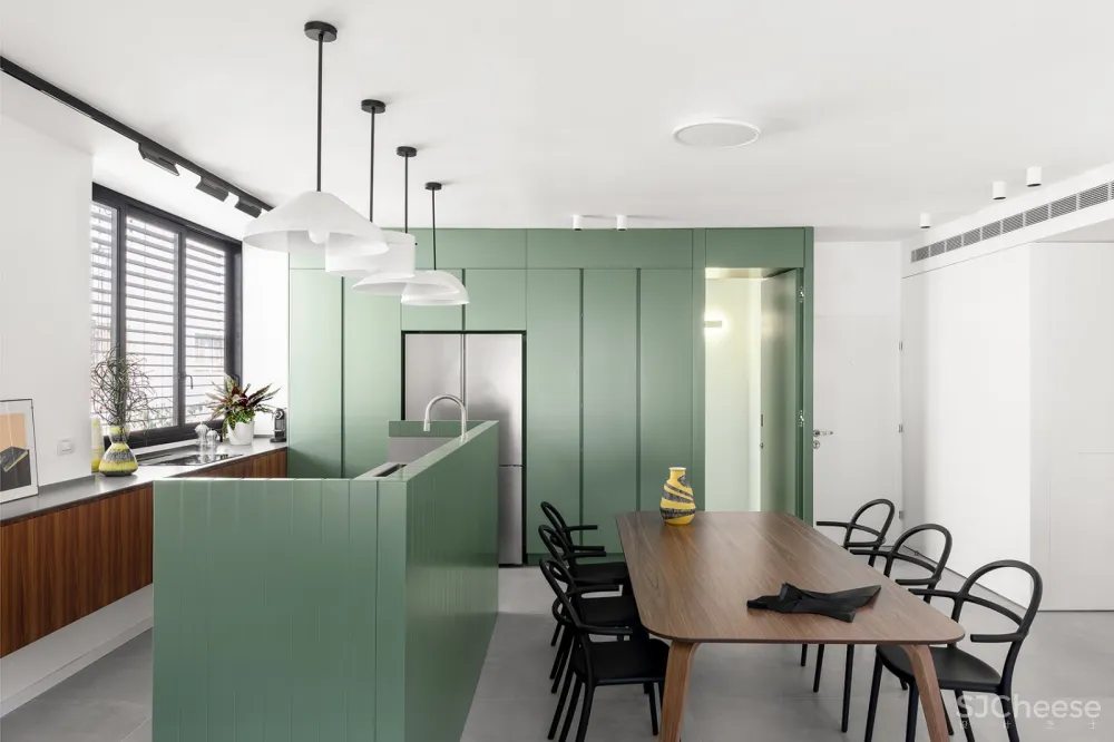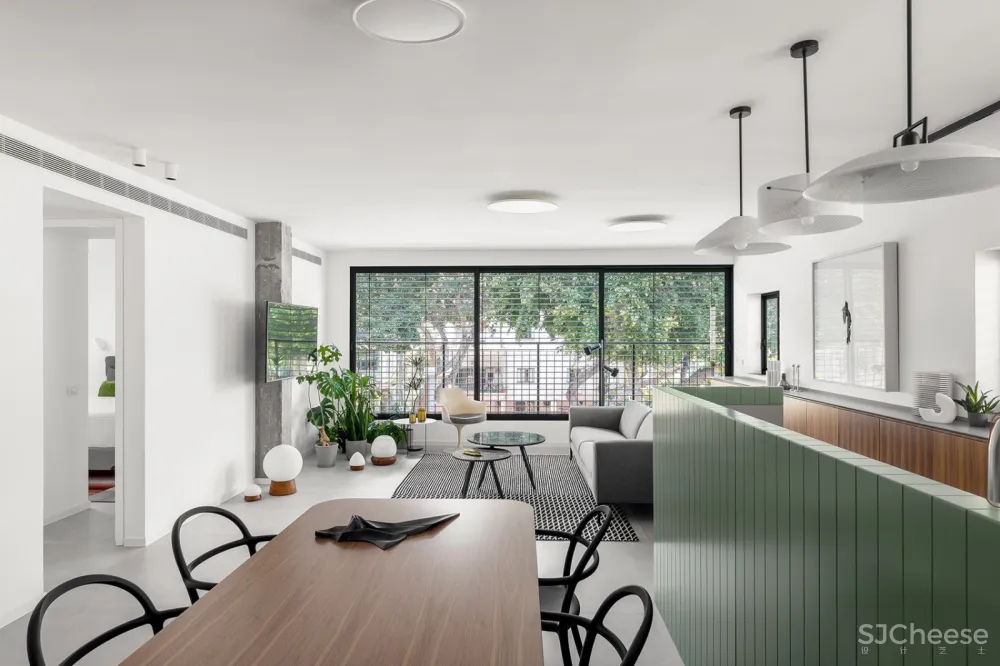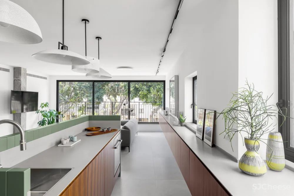 这座面积为100平方米的公寓住宅位于特拉维夫市的一条主林荫道上,它包含绿色的厨房和储物空间,以及一个9米长的线性木制家具。业主将这间公寓作为他们在城市中的生活据点:一个和亲朋好友在周末相聚的场所。