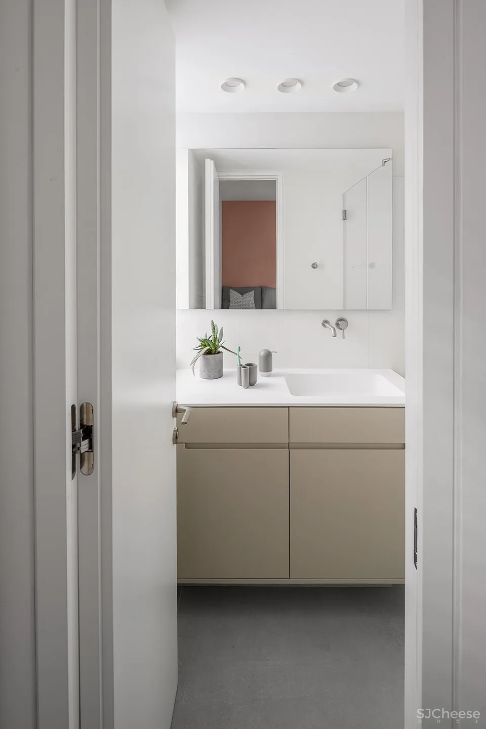 经过重新布局之后,公寓内的所有隔墙均被移除,空间变得十分开敞,同时能够沐浴到来自南面的充足阳光。矩形的主体空间作为开放式的起居和用餐区域,其外围是一个L形的私人空间,容纳了3间卧室,每间卧室都拥有专属的浴室。