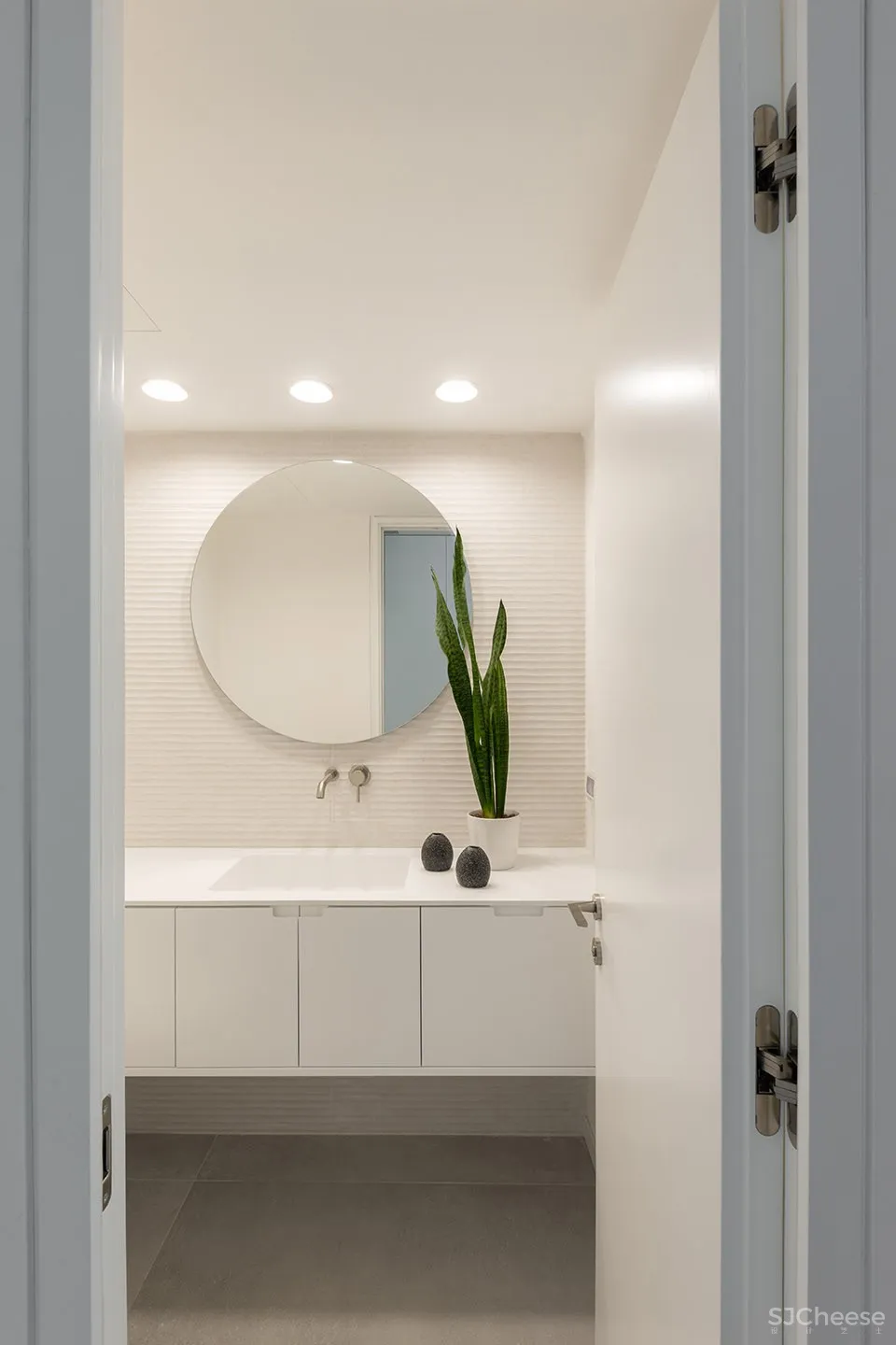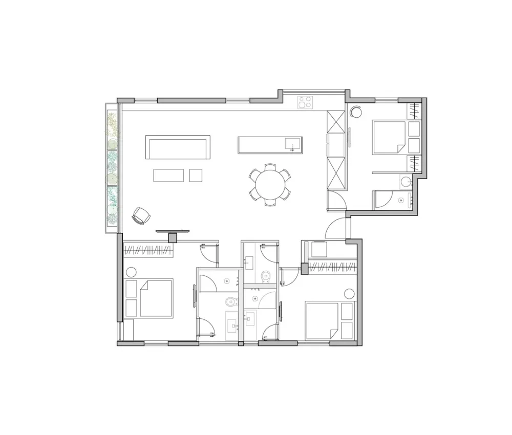 The original layout was completely transformed: All the interior walls were removed to open up the space and to enjoy the natural light of the southern exposure. The new layout is composed of a rectangular open living and dining space, which is wrapped by an L-shaped private area with 3 bedrooms, each one with its en-suite bathroom.