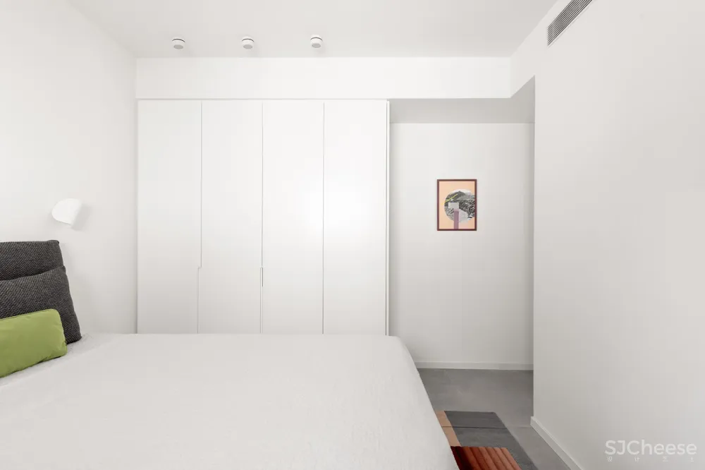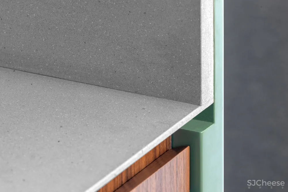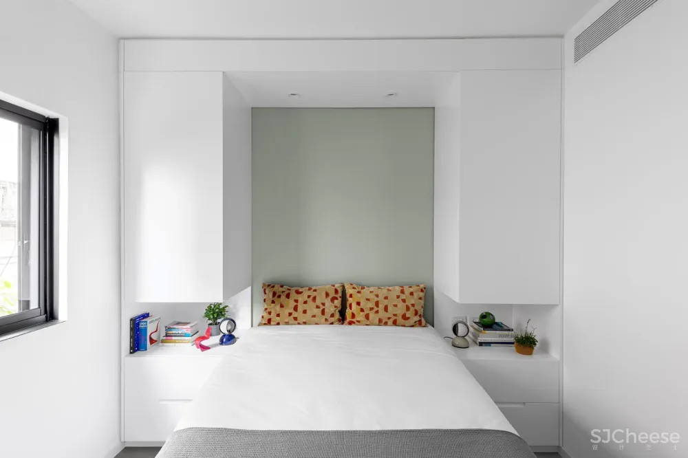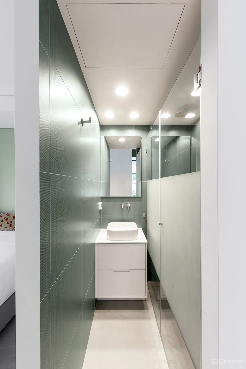 原本夹在四堵墙之间的厨房被整合至宽敞的起居及用餐空间,拥有朝向林荫道的宽阔视野。厨房包含三个主要的元素:橄榄绿色的高大橱柜,其中隐藏着一扇通往卧室的门;一个形如盒子的厨房岛;以及一个从厨房一直延伸到客厅的线性木制家具。配色方面,橄榄绿色与天然的胡桃木原色形成对比,呼应了建筑附近的林荫道和古老的榕树。通过置入厨房岛、定制灯具以及9米长的胡桃木立柜等一系列水平元素,设计师将视线巧妙地引向6米宽的全景窗户,从而将林荫道的生机引入室内。