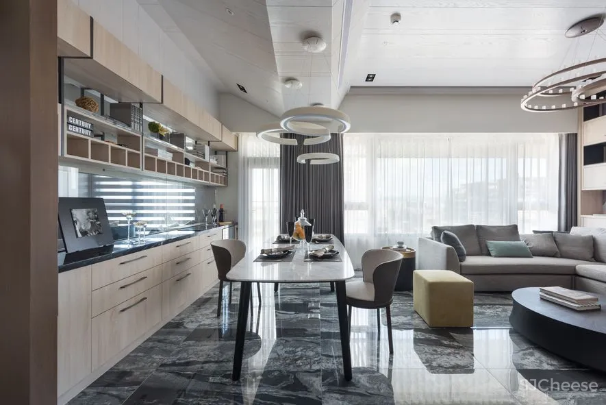 对比墙体的动态变化,地坪则铺设较为稳重的石纹磁砖,衔接深色软件以及晶莹的环形灯饰,提示情感交流的场域功能。柔亮的日光映照入室,显现脱去赘饰的天花板与机能柜体,以包梁挑高及半开放设计共构开阔情景。近身观察,两侧柜体藉由清玻和镂空设计,破解立面阻断视线的干扰;由旧电视墙改造而来的沙发壁柜,隐约透露浓淡笔画映衬地坪纹理,更加深家居的细腻层次。