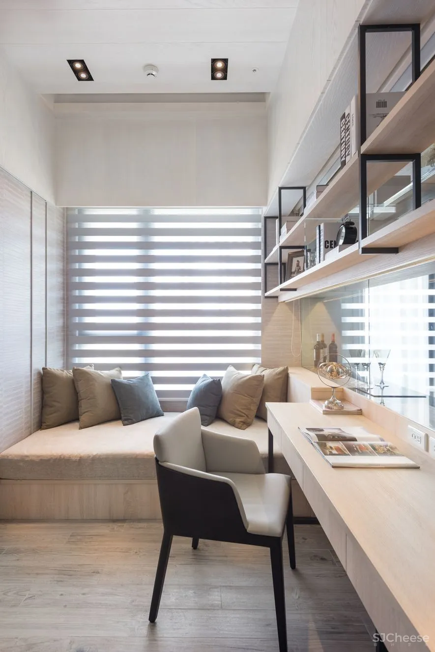 向深处行去,公领域的清爽语汇透过玻璃绵延进入书房,满室以清浅木质搭佐同色软件,为阅读时刻铺垫柔和氛围。两面开窗导引光线大方入室,映亮居室亦点亮思路;延着简约天幕而下,少许铁件利落搭出层架,桌椅则延续相同工法形塑出强烈的一体感,为从事贸易的屋主提供松懈思绪的所在。随着户外光影变化,自在调整卷帘开阖尺度;夜深倦读时,也能悄声推开暗门直往卧室。设计师将体贴使用者的心化为这扇门,恰到好处地于动线中开启,成为及早入眠的温柔提醒。