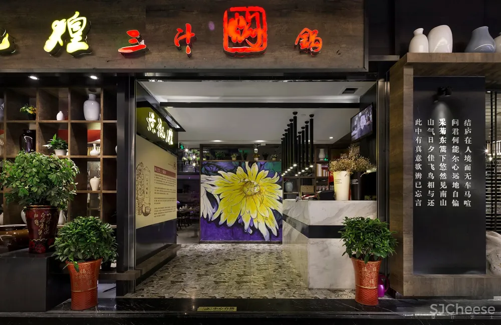 这家以全新面貌迎客的黄记煌三汁焖锅店是其第四代餐厅产品,在原本的品牌基础上融入了时下流行的餐吧经营模式,而整体的空间设计主题也围绕着“菊”展开,给食客以不同于以往的用餐环境体验。