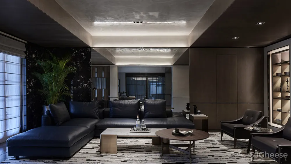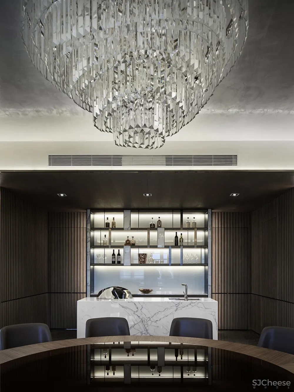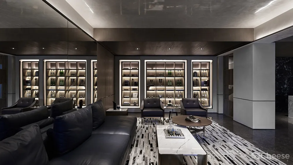 The semi-open wine & cigar area features a large area of mirror, which visually extends the space. The low-profile black sofa gives people a mysterious yet luxurious impression. And the exquisite wall cabinet offers ample space to display wine, cigars and related items.
