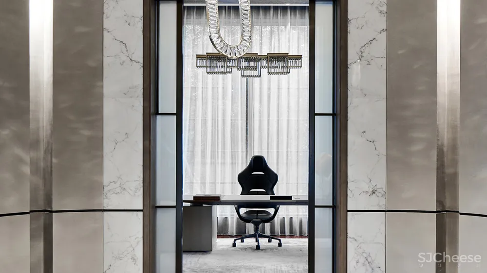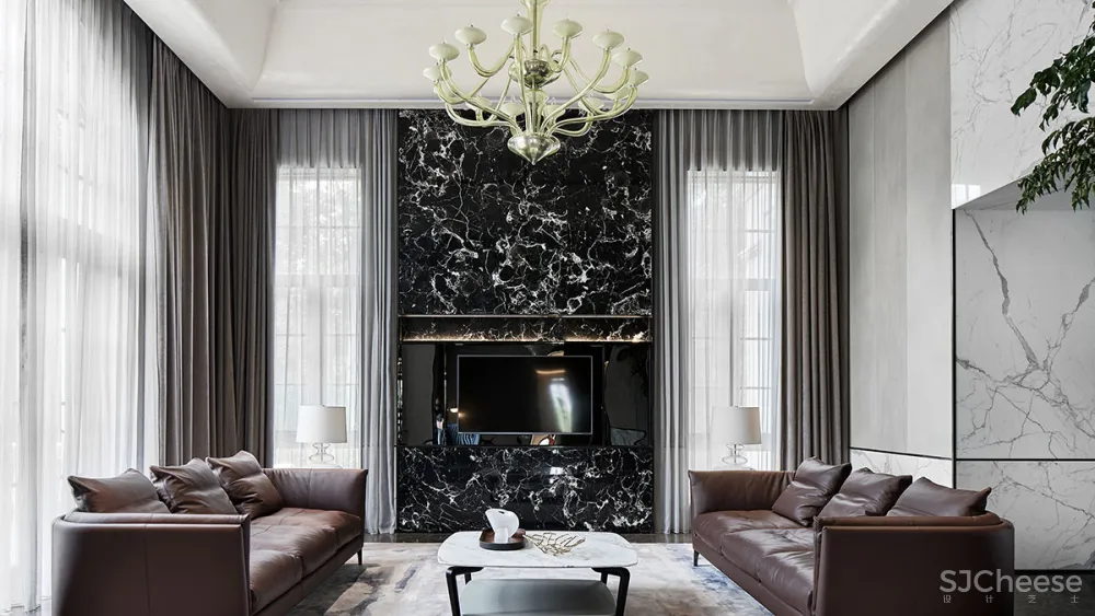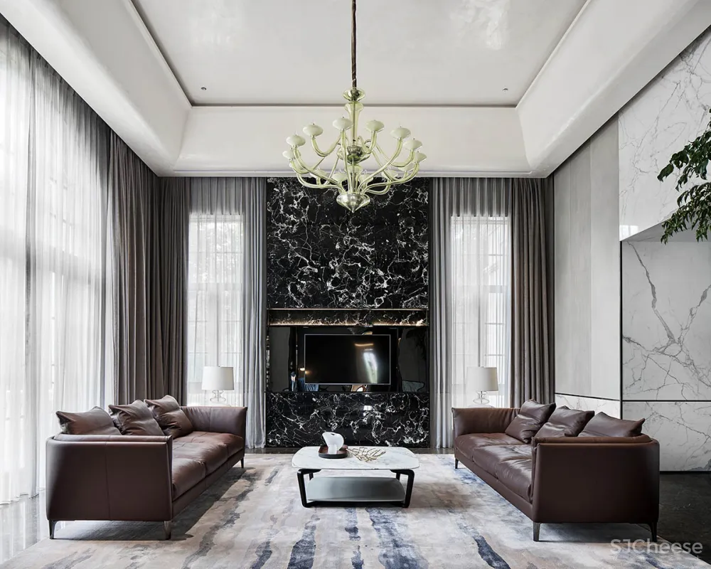 Opposite to the foyer is the open and bright reception room. The leather sofas are well matched with the marble backdrop wall characterized by clear grain. The flexible patterns on the carpet balance the rigidness of the space and inject vitality into it together with the light-green transparent chandelier. Daylight penetrates the soft gauze curtain and shines onto the interior, producing a cozy atmosphere for the owner and guests to chat.