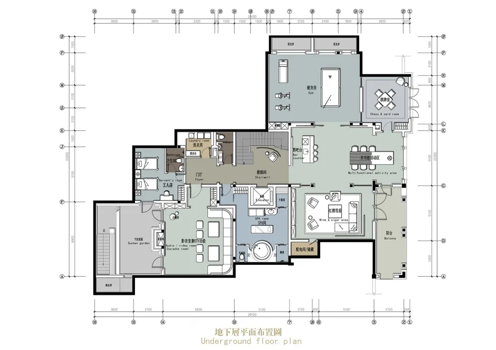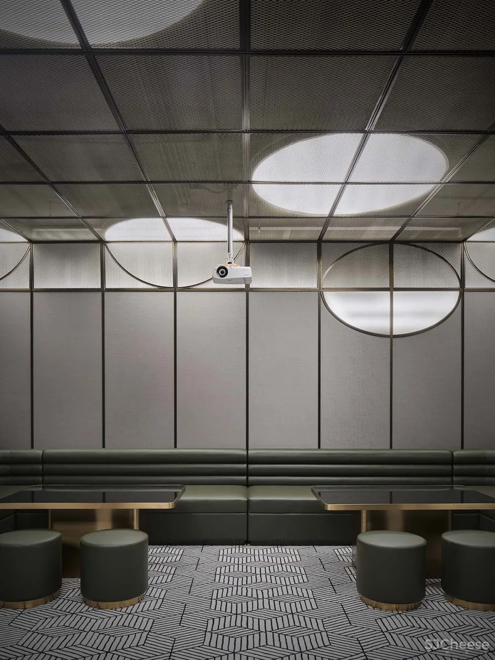 The audio / video room (also functions as a karaoke room) is set underground as well. The gray walls and dark green furniture make the space peaceful, while the gold lines inject flexibility and vitality into it, making it suitable for various family recreation and friend gathering activities.