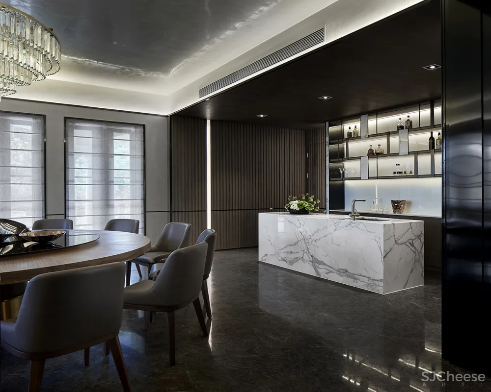 通过一扇拉门,进入餐厅。塞浦路斯灰大理石地面沉稳而时尚,一侧的调酒吧台彰显了屋主的格调,圆形餐桌符合中国人饮食习惯,吊顶与吊灯更是在用餐其间为圆满融洽的氛围述刻了形状。
