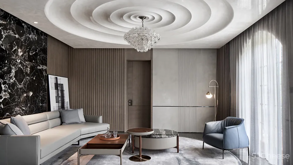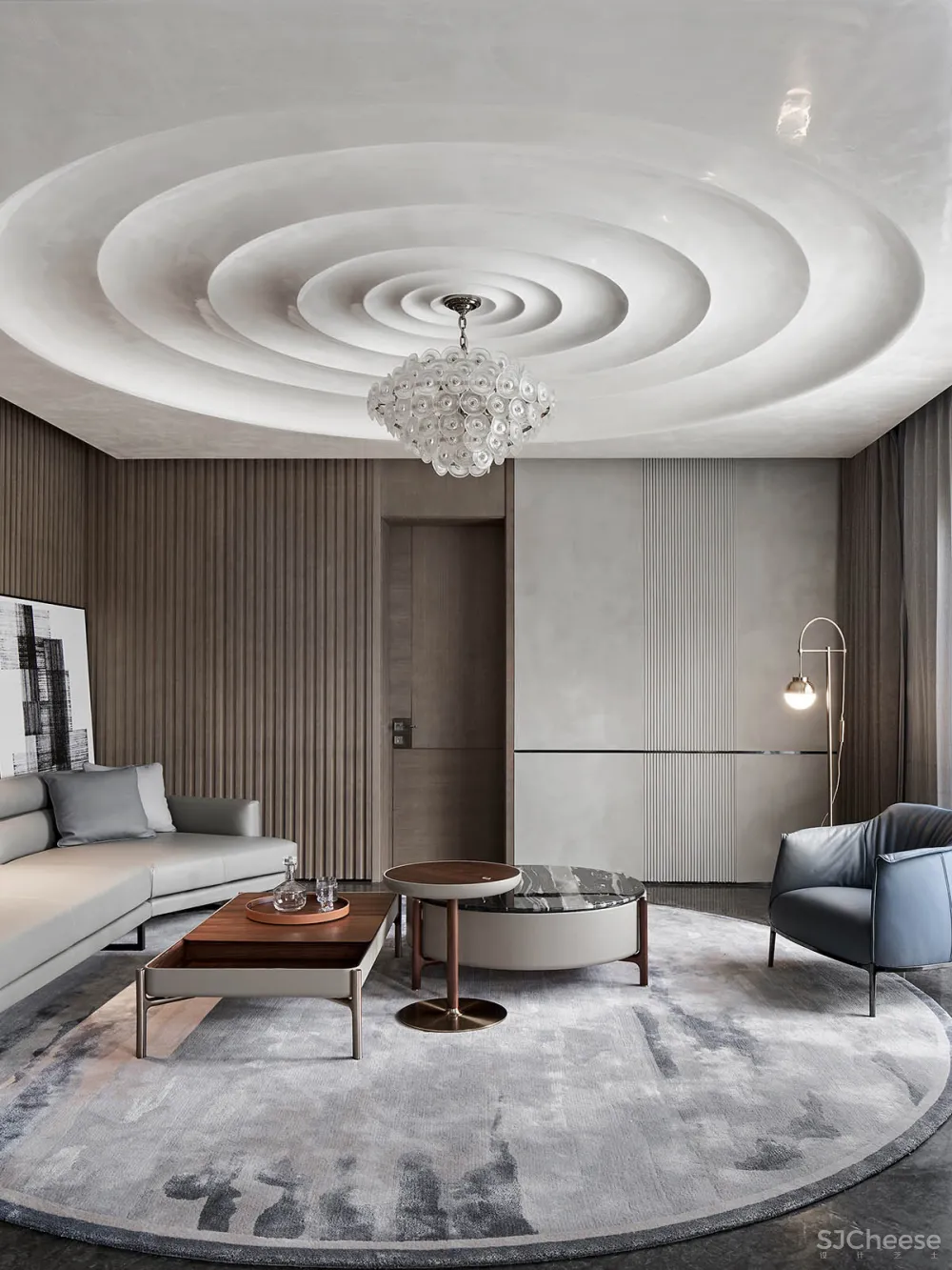 紧邻会客厅的,是悠闲舒怡的起居室。水滴涟漪般的吊顶让空间产生灵动的气息,永恒与美好在此波荡而开。地毯和茶几的几何形搭配平衡了空间,也使之层次更为多样,别具一格。