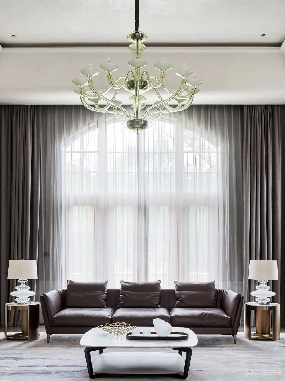 门厅正对着的是空间开阔、窗明几净的会客厅。沉稳的皮质沙发搭配质地清晰的大理石背景墙,地毯柔和的纹路综合了空间的刚硬,与淡绿色透明吊灯一起,为空间增添了几分活力。阳光透过柔纱窗帘轻拂在会客厅内,宾客与屋主得以细语交谈,宾主尽欢。