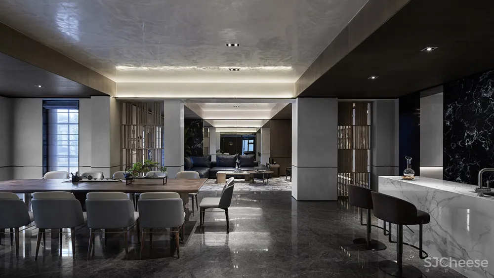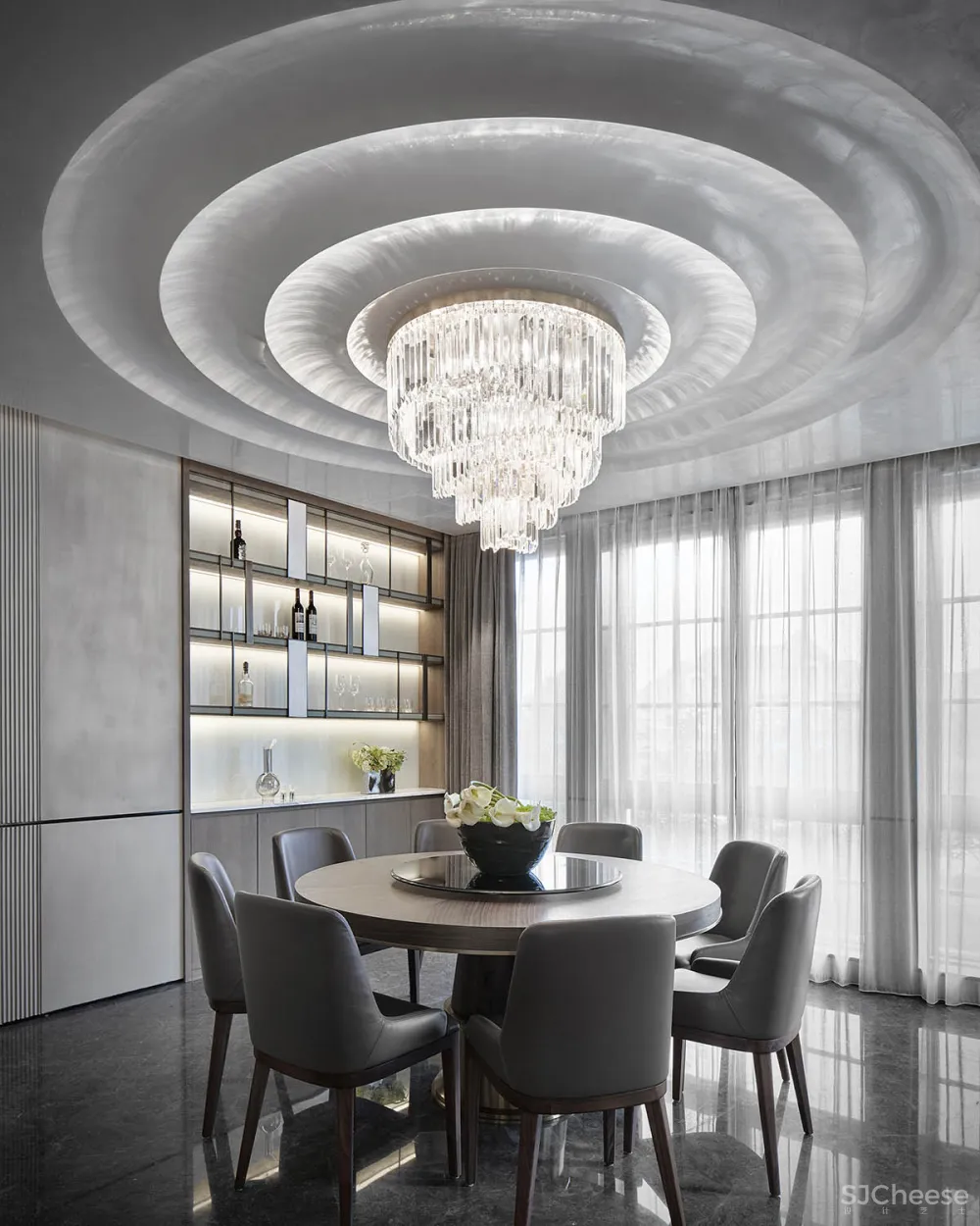 Through a sliding door, it arrives at the dining room. The gray marble flooring is steady and stylish, and the bar counter for making mixed drinks on the side reflects the owner’s taste. The dining table has a round shape, which fits into Chinese people’s eating habits. Besides, the ripples-like suspended ceilings and the unique pendant lamp are perfectly coordinated, generating an intimate dining atmosphere.