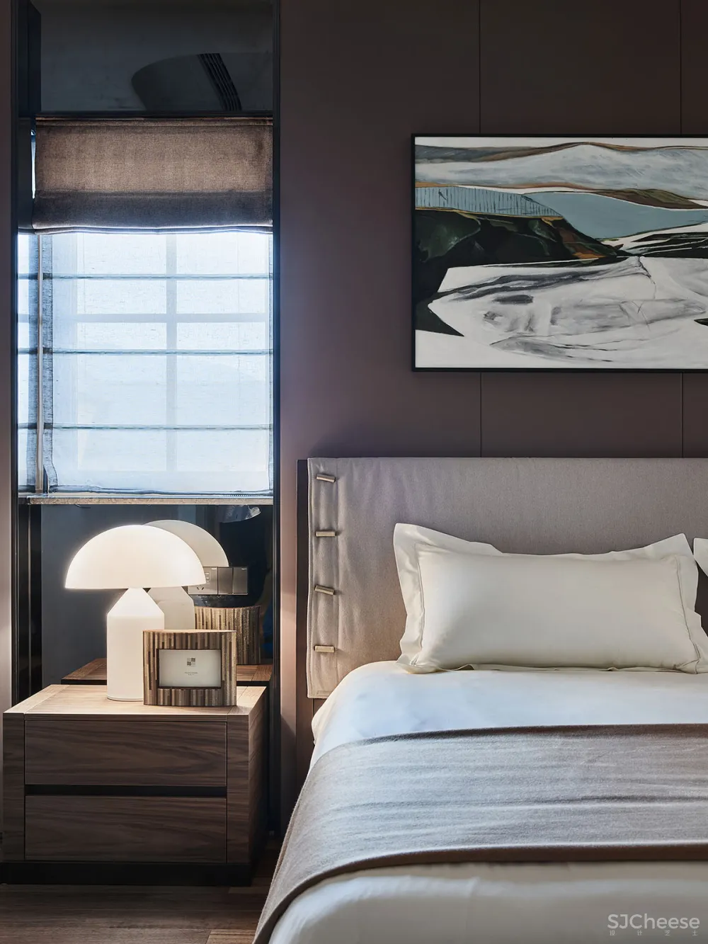 穿过楼梯间,主卧在楼层的一侧,色调柔和,质地讲究,不过于追求时尚,但隐藏的线条和肌理使人安逸。床头浅灰绿背景墙在空间中十分亮眼,与深色地毯产生了空间过渡,窗边精致的深色土耳其蓝单人皮质沙发,为主卧画龙点睛。正对床榻的抽象画,诠释着屋主不凡的品位。