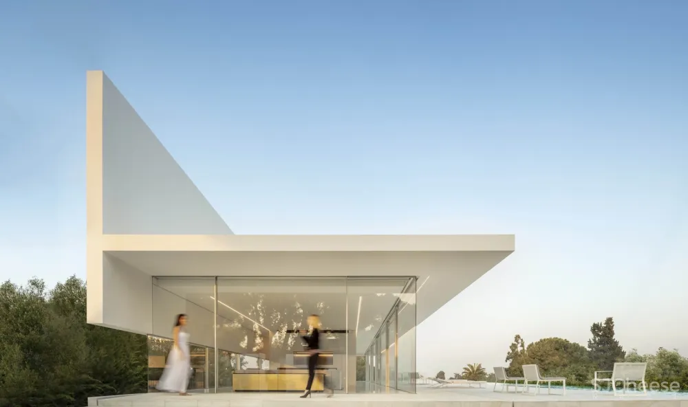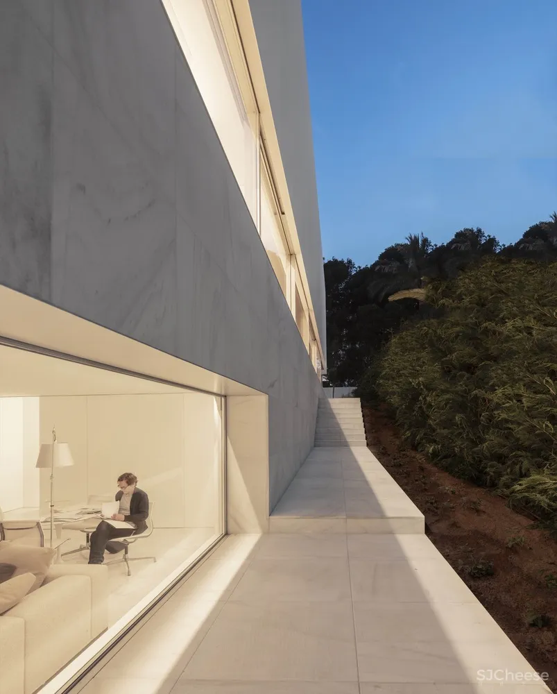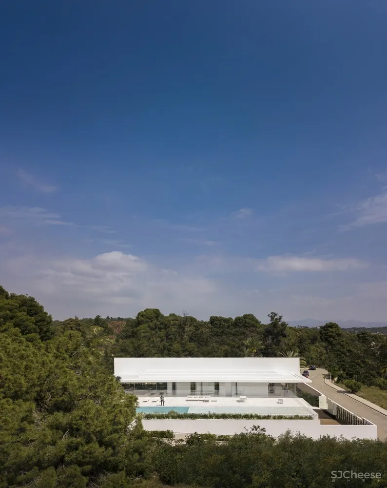 一个自由的方盒子体量容纳着所有的住宅空间,并对住宅的私密性进行了处理,从而创造了多种流线和空间使用的可能性。主要居住空间位于T字型墙体的悬挑部分(即平行于地面的一侧墙体)之下,与室外空间相连。游泳池和室外露台位于花园安静的一角。而学习工作区则位于室内的东侧区域,享有最佳景观朝向。