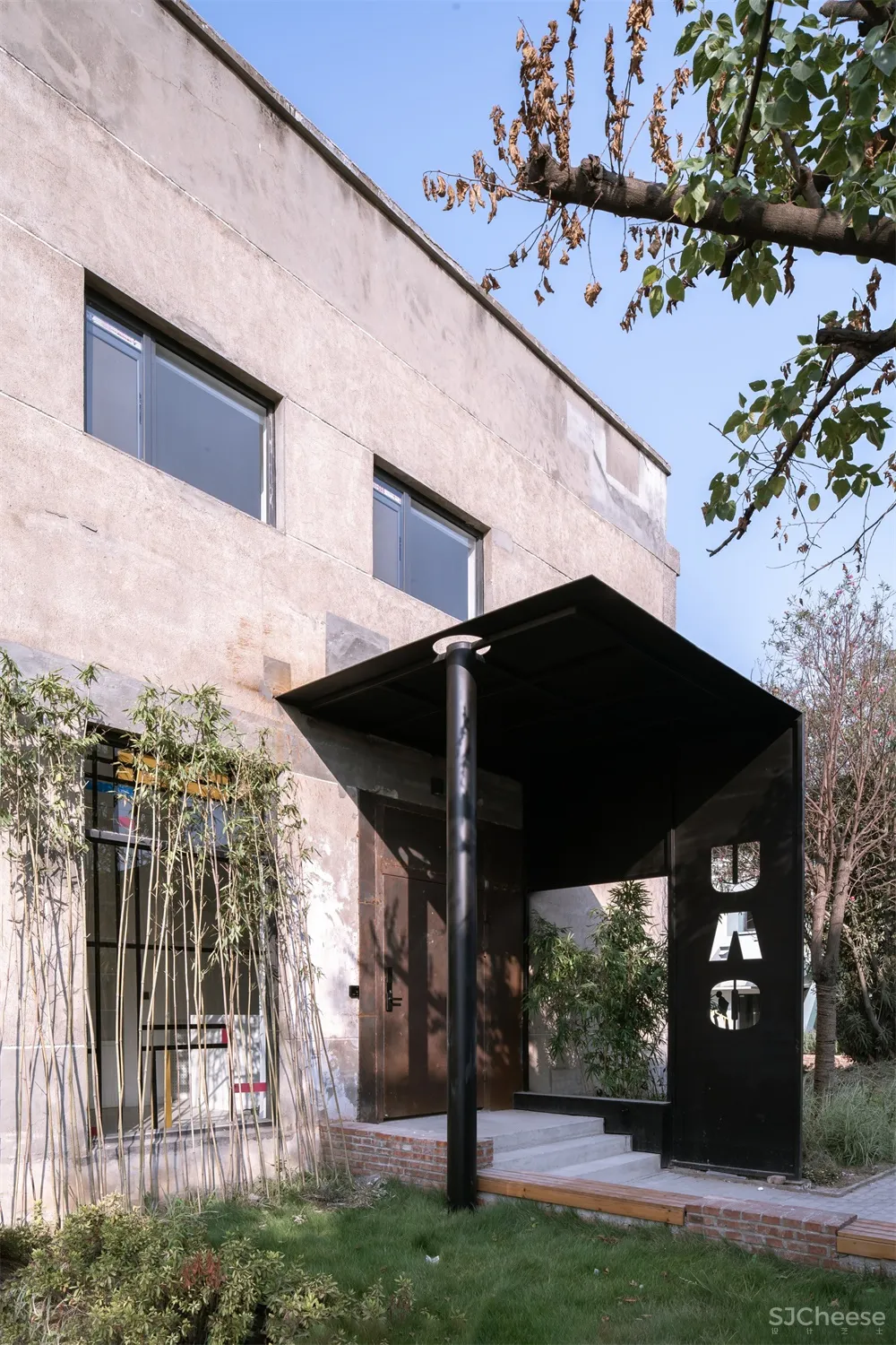 The original north facing gate is sealed as a ground glass window, and the main entrance is modified in the East gable. The reason for the change is from the plane layout streamline: the hall, as the main office space, needs a relatively closed environment; the front desk is designed on the lower side of the East; the gate is also designed with steel structure, and the black column is the rest of the supporting column of the internal sandwich structure.