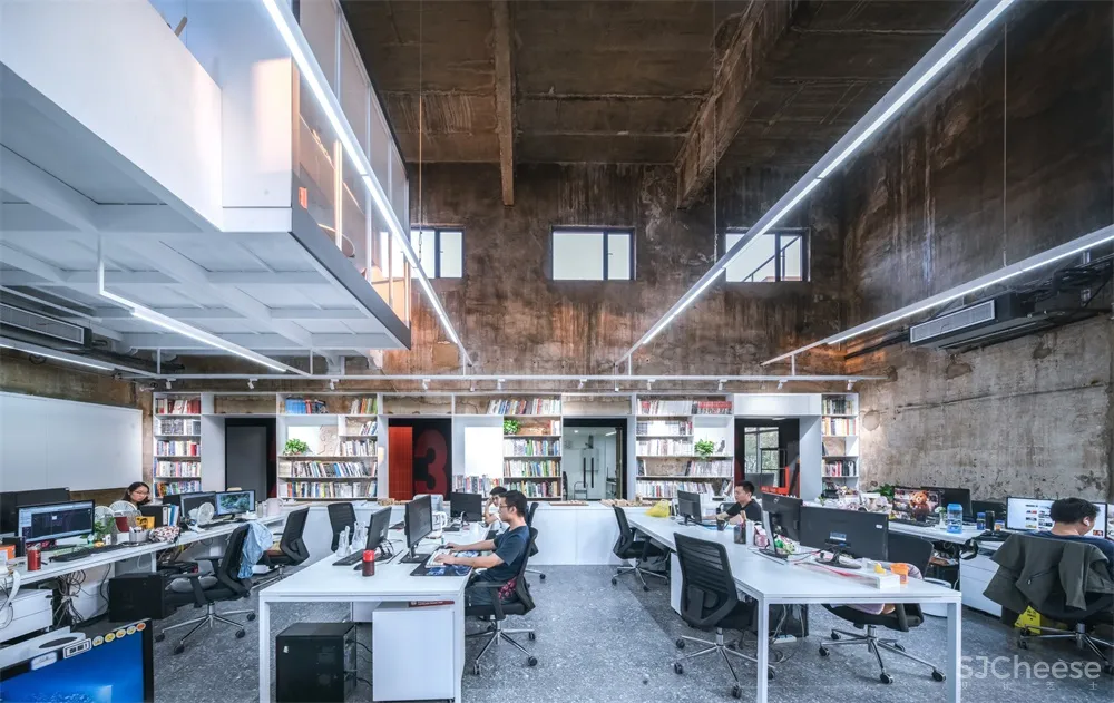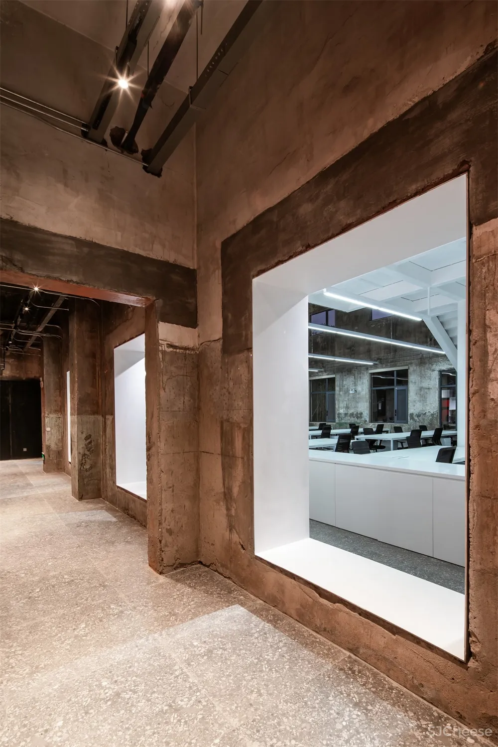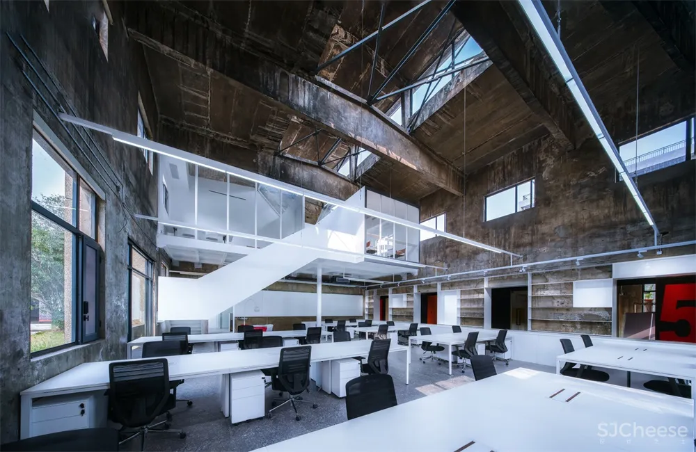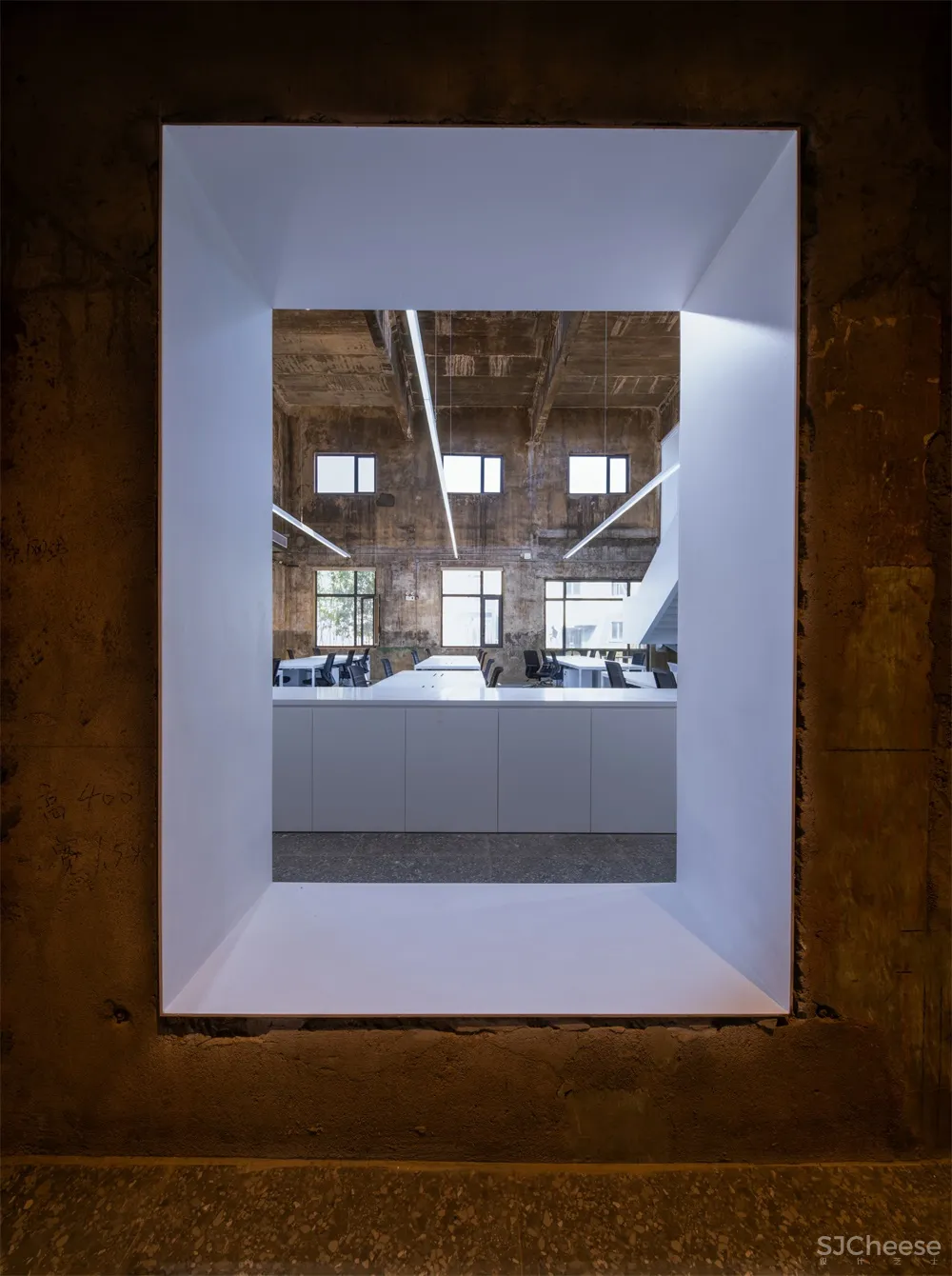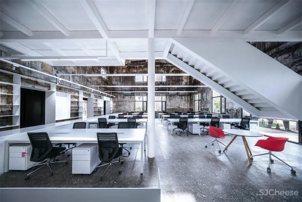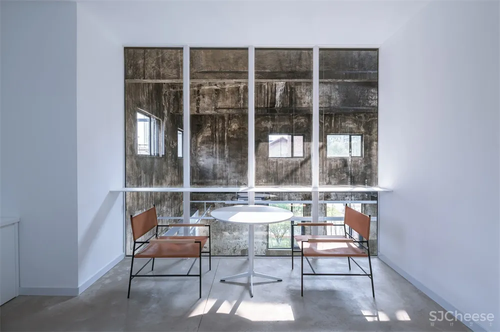 In the process of design, it is found that there is a single small building with a high void in the core area of the plant, which is located next to the tall red brick chimney and water tower. The former is the distribution motor room of the industrial plant. The towering interior space, the sun pouring down from the skylight on the top and the window on the mezzanine, is shining on the smoky and burning old wall, which is full of historical traces, with a strong sense of space; the founder and chief architect of UAO, Li Tao, decides to rent it as his own office space.