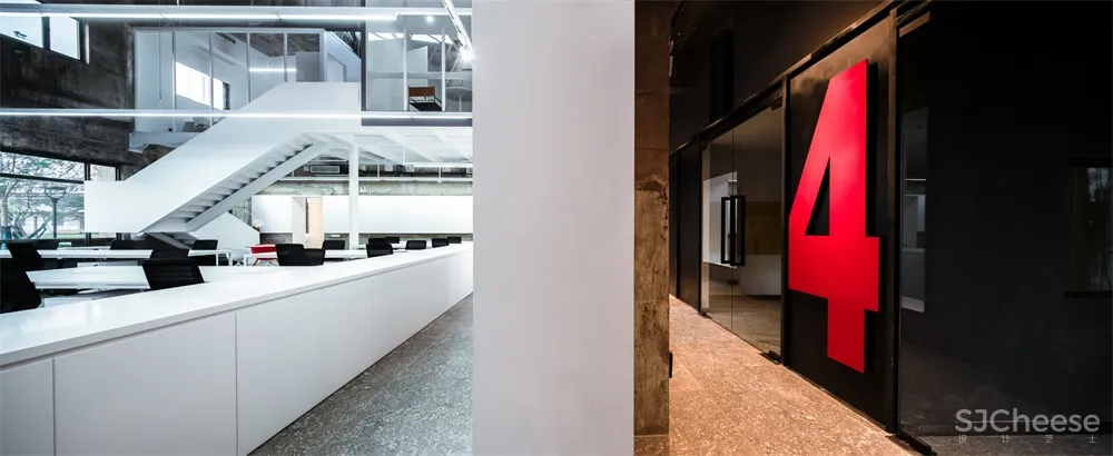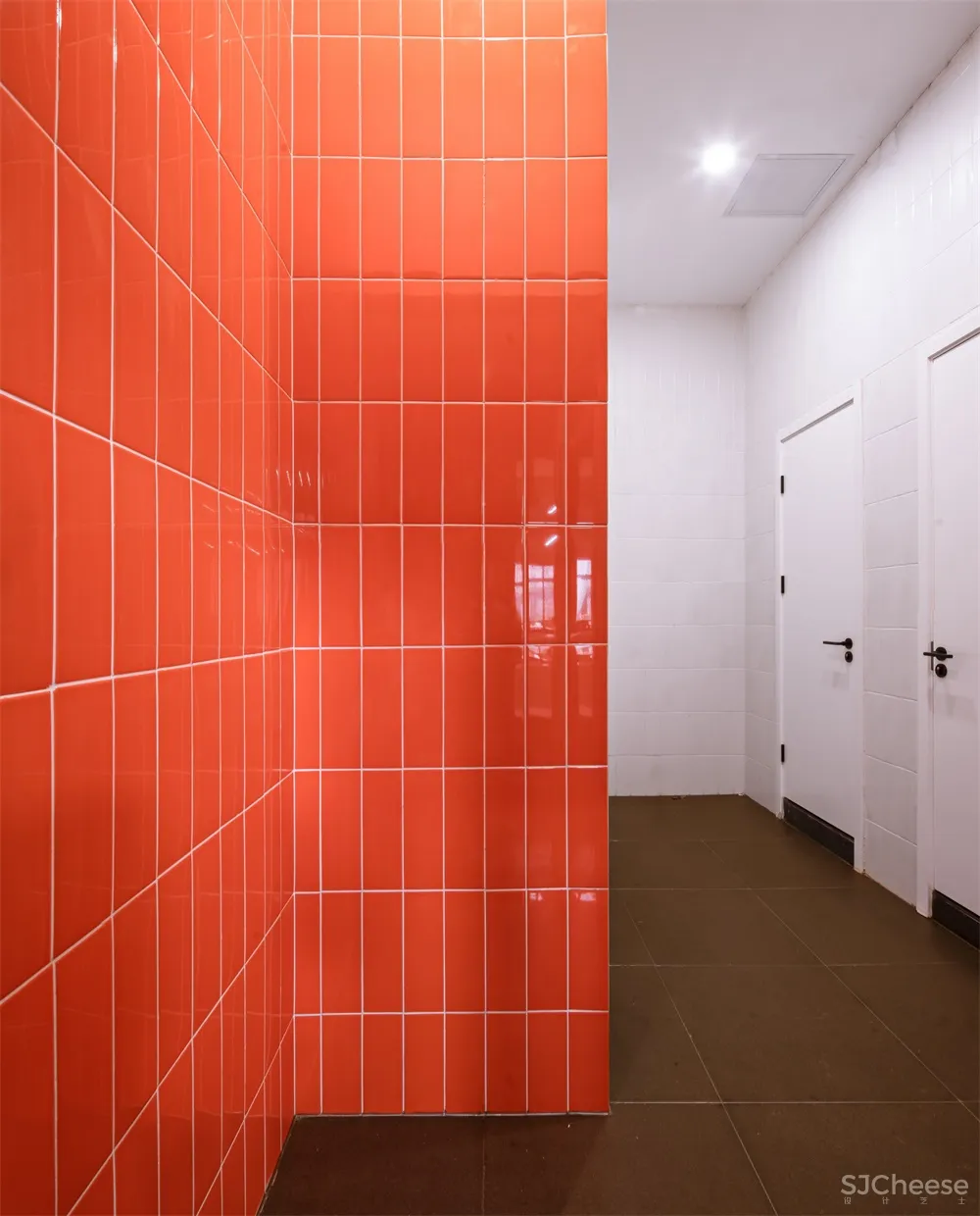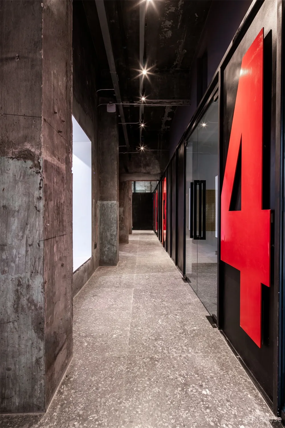 The number 12345 of service space corridor is painted red with steel plate welding. It jumps out of the dark environment of the corridor, making it have a depth of field when looking through the window hole in the hall to the corridor. It also gives the office different warm nature, and the popular “Normcore” opened the distance, but also gives the living scene experience;