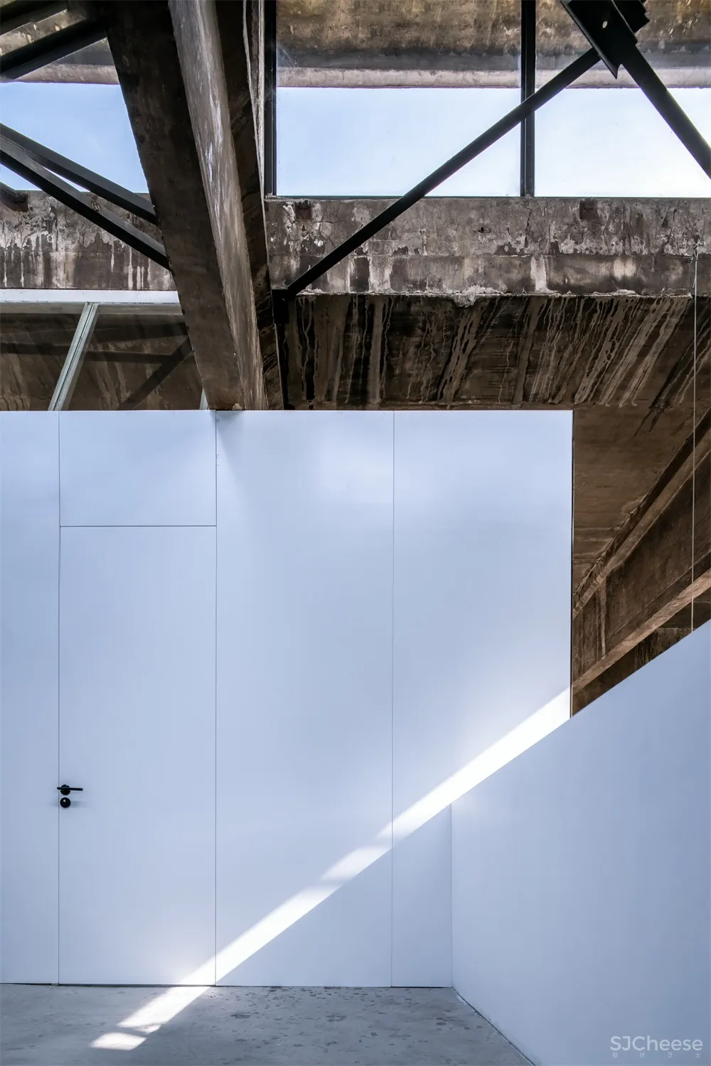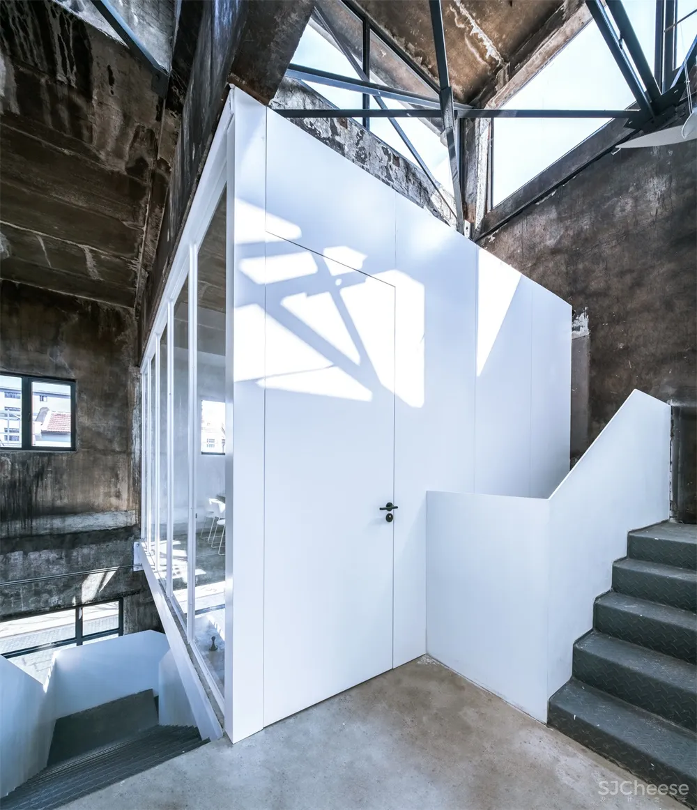 The mezzanine is only supported by a 200mm diameter column in the middle, and the folding staircase strengthens the weight and floating sense of the mezzanine. It strengthens the independent supporting function of the structure through the expression of the building, similar to the column in the center of Xiaoyuan’s White House. The light and ingenious central column contrasts with the thick and historic wall around – the new volume is reflected by pure white. , the old wall is only painted with curing agent after cleaning, which keeps the original trace of smoke, fire and even dirt, thus creating a new dialogue and contrast with the old. This kind of “dirty” is also the characteristics and history of the original space.