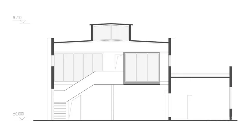 建筑师在画剖面图的时候,会将剖到的墙体等建筑主体部分涂成灰色淡显的填充;因而在夹层右侧突出来的盒子的四周,也将其四周围合的方框截面,刷成了灰色油漆,它的目的其实隐喻了这里像图纸中一样被剖切了一刀,如同建筑师在蓝图剖面图中要表达的那样。