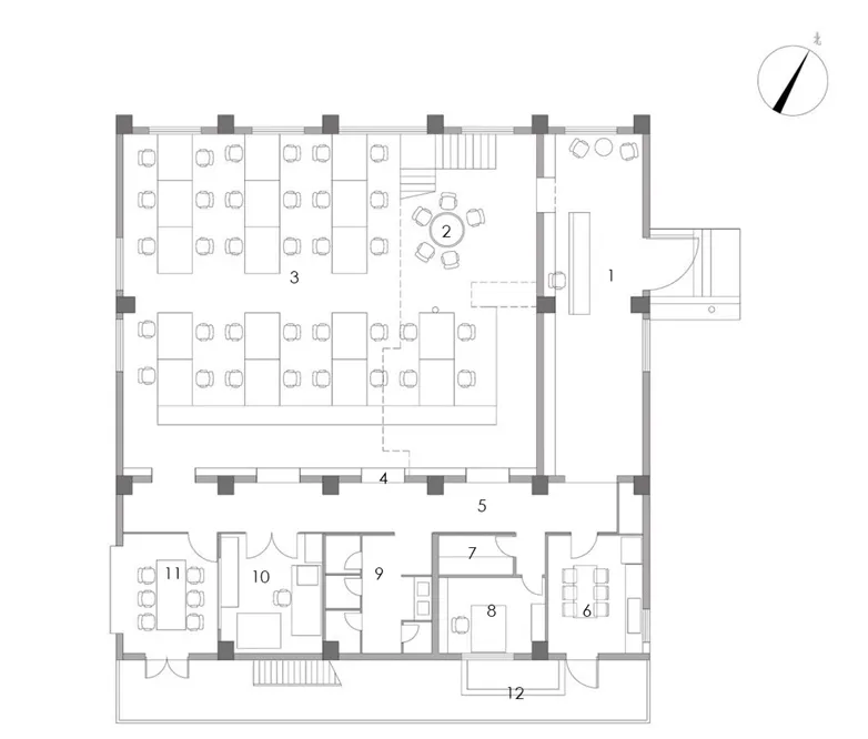 An office is not just a single work scene, work and life are inseparable. This is also a big starting point of this design: the roof platform in the low area is arranged as the roof platform of BBQ area, which is also an excellent place for professional forum to share; in the small courtyard, a fish pond is arranged, which can be directly out of the tea room to the small courtyard; all scenes are unfolded around work and life.