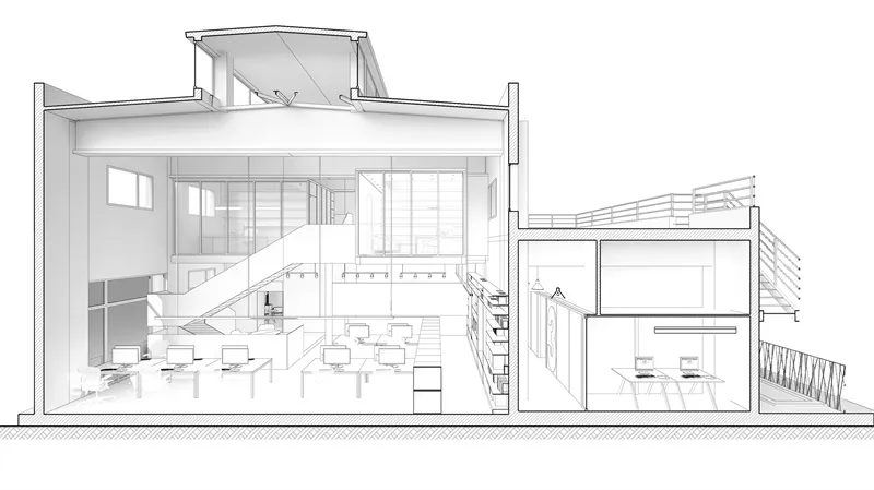 建筑设计,经常首先从平面布局入手,但这个项目的高耸空间特质,使得我们的设计在第一时间就考虑从剖面入手:在高耸空间内设置夹层,夹层的高度比原有二层要低900MM,其目的是在高耸空间内形成完美的比例关系;在底层配套服务区域,将茶水间和模型室楼上设置夹层休息室和模型材料间,但是放弃了卫生间、会议室楼上的夹层设置,目的是保留空间的高低节奏,为不同空间满足不同的观感和感受,比如会议讨论空间较高的设置,也方便各种讨论和碰撞。