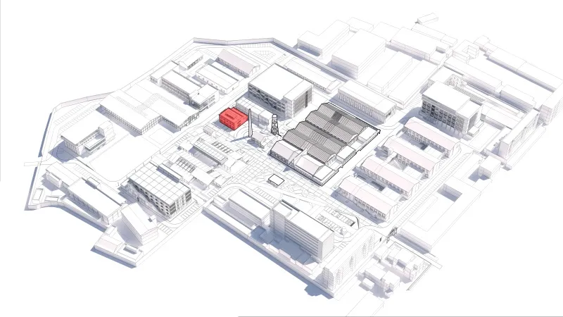 ∇ 红坊全区鸟瞰图(红色为UAO新办公室)Aerial view of the whole area of Hongfang (UAO new office in red)