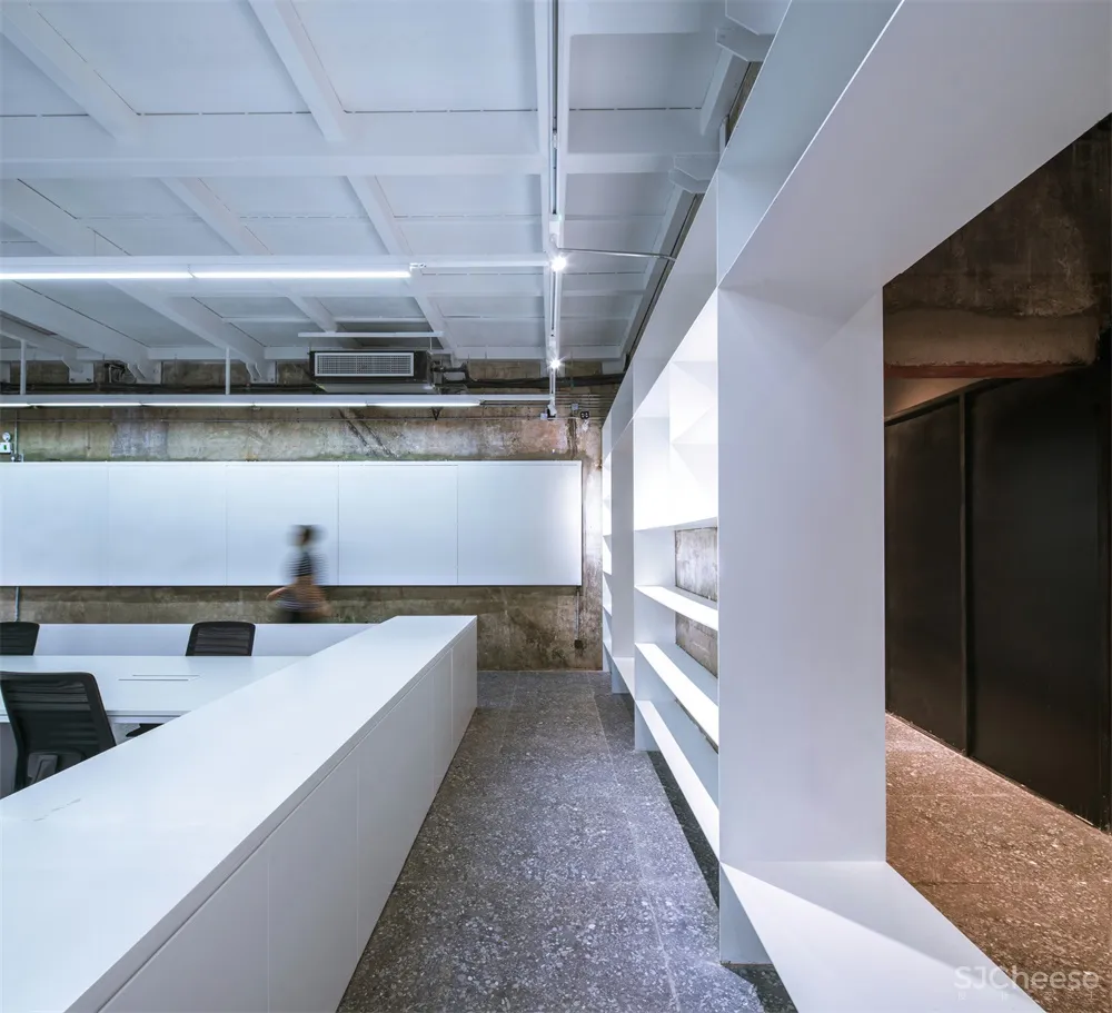 In terms of functional relationship, the office hall with high space and the supporting space with low height constitute the service space and service space described by Louis Kahn. The design deliberately distinguishes between the materials and colors. The service space (including tea room, rest room, model room, printing room, meeting room, etc.) adopts black tone, with red numbers and local color of the room, such as rest room cubicle Orange and dark green inside; tiles in the tea room; yellow hole board hanging board in the model room; and the space to be served (i.e. the office hall and the meeting room in the front hall, etc., are the space tonality rationally controlled with pure white as the main color); the service space adopts warm white light with color temperature of 3000K, while the space to be served adopts white light with color temperature of 4000K;