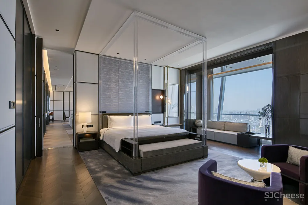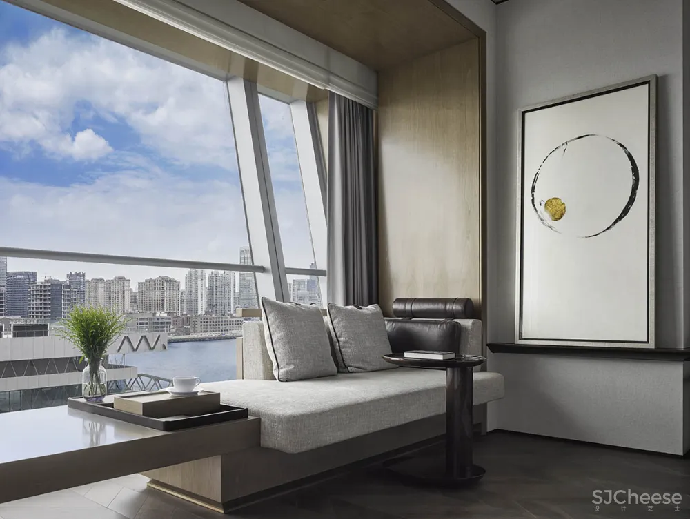 仿佛穿梭于夕阳西下的河流,宾客经过精心设计的客房层走道来到了旅程的终点站。走道两侧透过水纹玻璃壁灯及嵌入于天花中的花式图案格栅细节营造出光影效果,犹如河岸两边华灯初上的建筑剪影描绘。客房的设计精致典雅,主色调由米白色构成,搭配酝酿着天边夕阳暮色的水纹图案地毯,与窗框外黄浦江的辽阔天际及江水相映成辉,完美呈现了室内与户外相互结合的视觉延伸体验。深色大理石、织物、实木和玻璃的组合碰撞出摩登与经典并存的休憩空间。宾客可坐在靠落地玻璃幕墙的休闲躺椅上欣赏黄浦江迷人景致,领略当下生活的焕活之美。