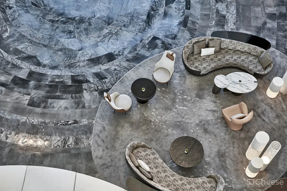 作为旅程的起点,设计师将中庭大厅打造为船只靠岸、停泊、交流、汇集的温馨港湾。大堂中每一处的空间犹如河流上随机投下石子后布下的涟漪般,自然地定位于弧形大堂空间中。60米的挑高中庭形成一个造型独特的A字,远望过去,犹如一艘停泊在黄浦江岸的客船。各个柜台皆以几何雕塑造型呈现,每一道外型俐落、简洁的家具也都比拟河流上穿梭的大小船只,栖游其中。贯穿中庭的落地窗自然地将光影引入室内,将远处滨江景致映入眼帘。跟随着中庭十字主轴的动线,宾客可通过左边茶廊或右边的电梯厅,继续探索他们的旅程。