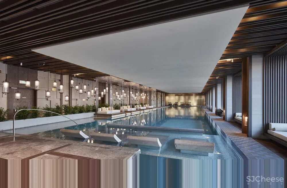 酒店还提供了能让宾客放松身心和焕发活力的水疗中心和无边际泳池。室内恒温的无边际泳池透过设计巧思营造了宛如瀑布般倾泻而下继而流入室外真实黄浦江的视觉体验。从泳池一侧的浮亭往窗外看,框住的河景宛若一幅绝美的自然画作,为宾客带来惊艳的视觉享受。除了延续框架的设计概念,水疗中心通过水纹和气泡透明玻璃营造了温馨自然的光影动态。