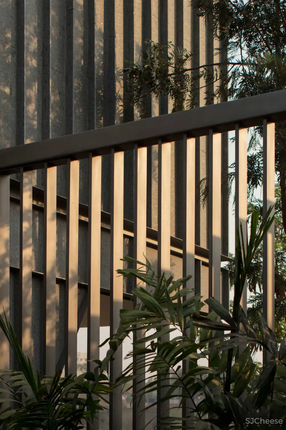 The house is elevated above ground as a lightweight steel structure, making the natural terrain below a celebrated focus of the design. The layout is split into three stacked volumes, each of which features a glass facade facing the lake, with recessed balconies clad in teak. The facades along the sides of the house and facing the road are lined with slabs and thin ribs of locally quarried grey granite, creating shadowed texture while maintaining privacy from the neighbours. The teak timber cladding continues throughout the interior, accented by full-height timber screens that allow for filtered views to the gardens and city beyond.