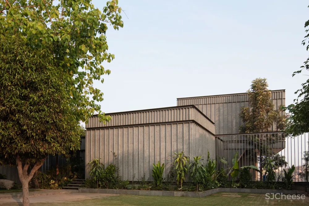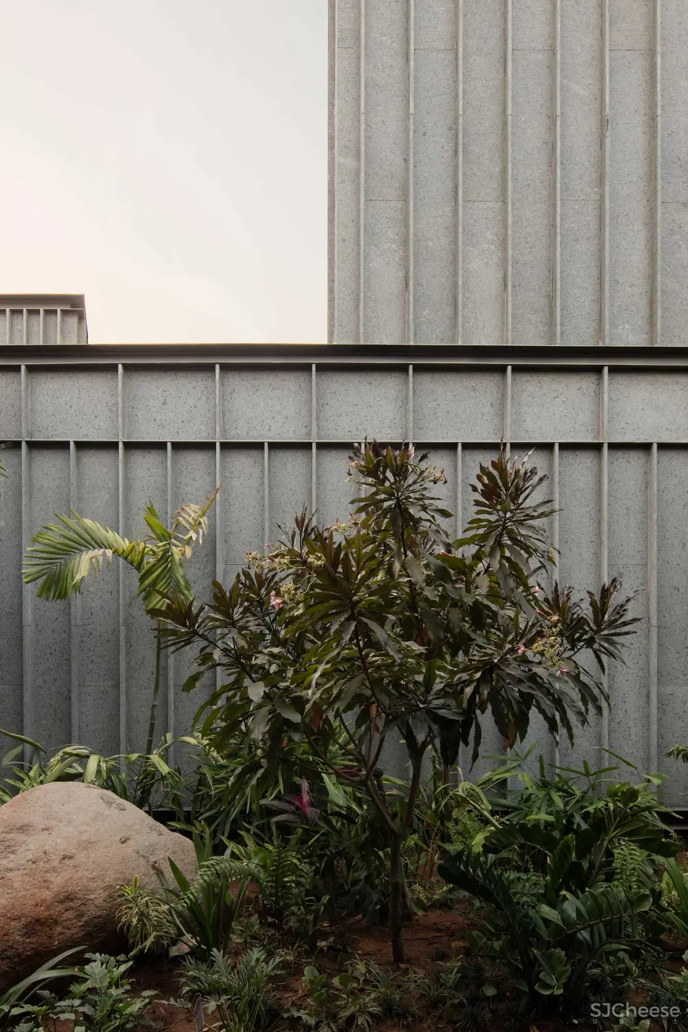 建筑师利用重和轻之间的张力,为Lake House建立大胆的材料和空间表现。花岗岩材用于建筑外观与地面铺装是占主导地位,同时也展示了石匠的技巧和细节的精确性。景观植物美化是该项目不可分割的一部分,它突出了湿地和旱地之间的过渡。从街道上看,房子显得坚实和沉重,隐藏着全景湖与郁郁葱葱的绿色植物,这与城市炎热干燥的气候是格格不入的。当人穿过整个建筑时,绿草如茵的种植园被抛在后面,海得拉巴干燥的岩石和干旱的景观也随着广阔的视野而显现。