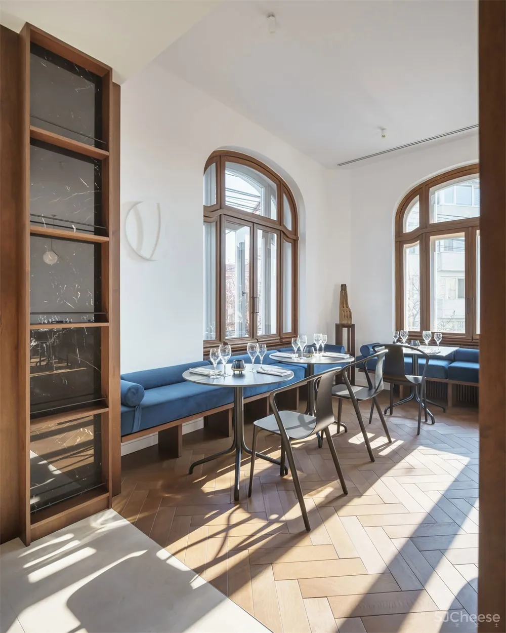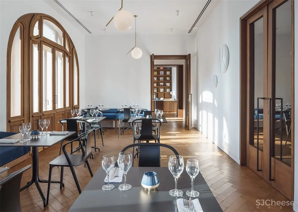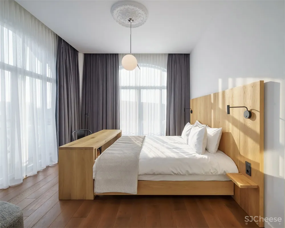 经过仔细考虑,丰富的材料与颜色的选择都涉及到历史因素与当代元素。接待处,大堂和咖啡店的特点是染色实心橡木地板,细木工和定制家具。通往客房的原始橡木楼梯被小心翼翼地拆除,并被送到特兰西瓦尼亚的木匠那里进行修复。卧室是中性和清新的氛围,全高的亚麻窗帘,温暖的木床和优雅的吊灯。地下一层的水疗中心采用保加利亚石灰石、黑色大理石和染色的实心橡木为特色,天花板的缝隙增强了自然材料的反射效果。